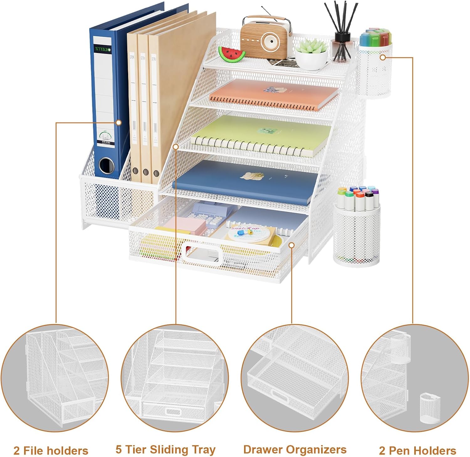 - 📂【Excellent Desk Organizer】Marbrasse newly launched a versatile desk file organizer that provides a user-friendly solution for office organization. It features five sliding trays, two magazine holders, two hanging pencil holders, and a sliding drawer that effectively declutters your desktop and offers convenience to your workspace. With its specialized designs that cater to office needs, this exceptional desk organizer is undoubtedly the optimal choice for your office supplies.