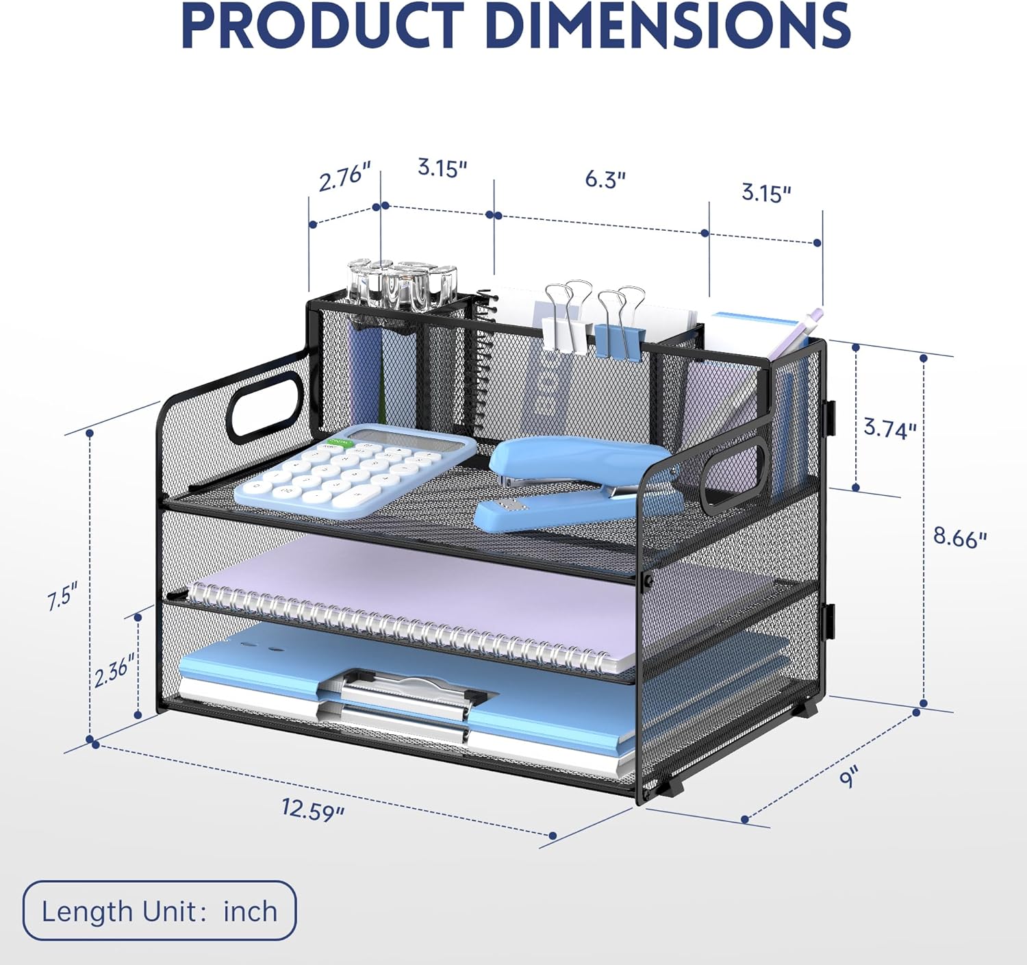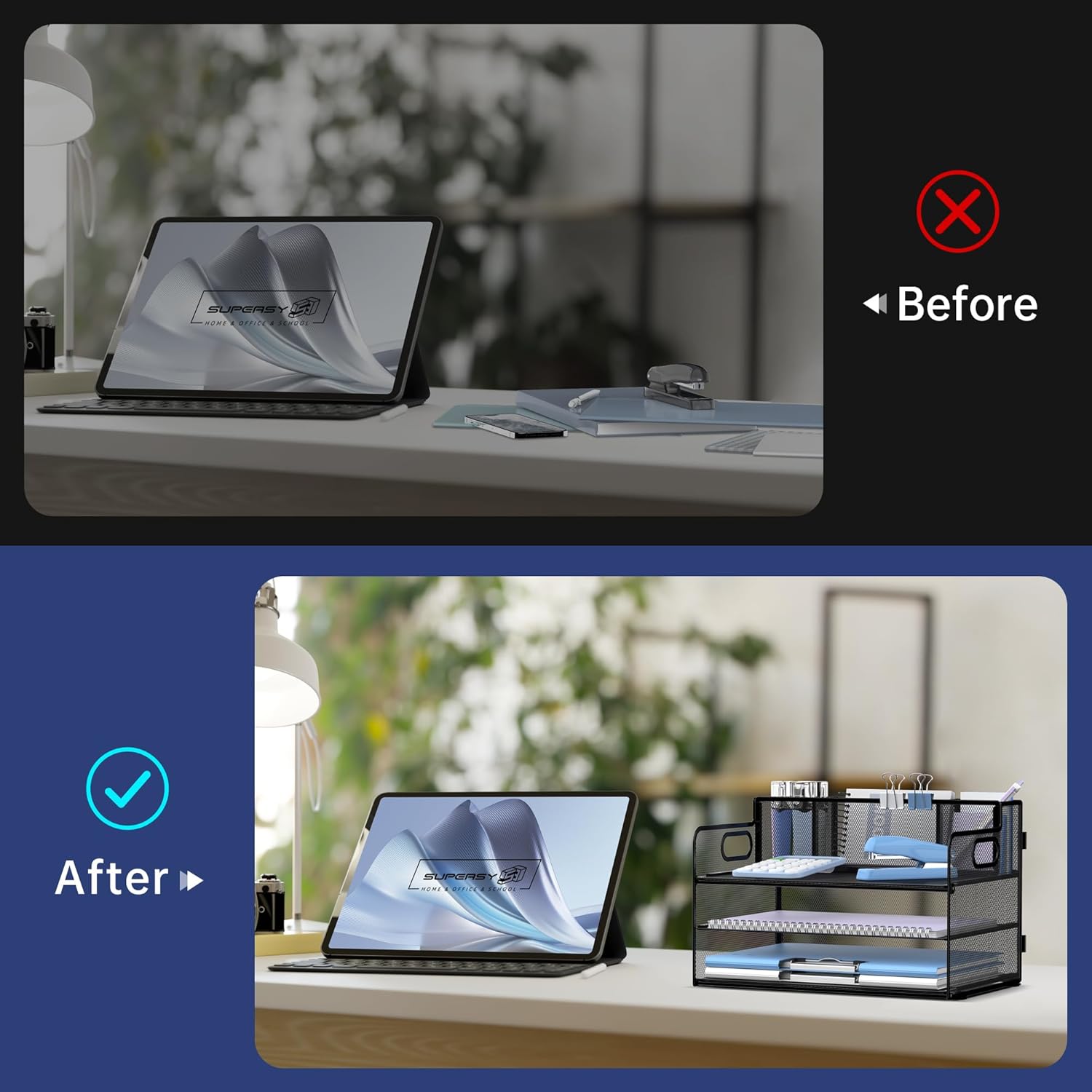 - 3 Trays & 3 Pen Holders: Supeasy black desk organizers are multifunctional. This paper organizer provides 3 trays for organizing papers, letters, folders, files, books, mails, documents, etc. The pen holders on the top help organize your various pens, small notebooks, scissors and stapler. Our file organizer gives you large capacity for desk organization, keeping your office clean and tidy.