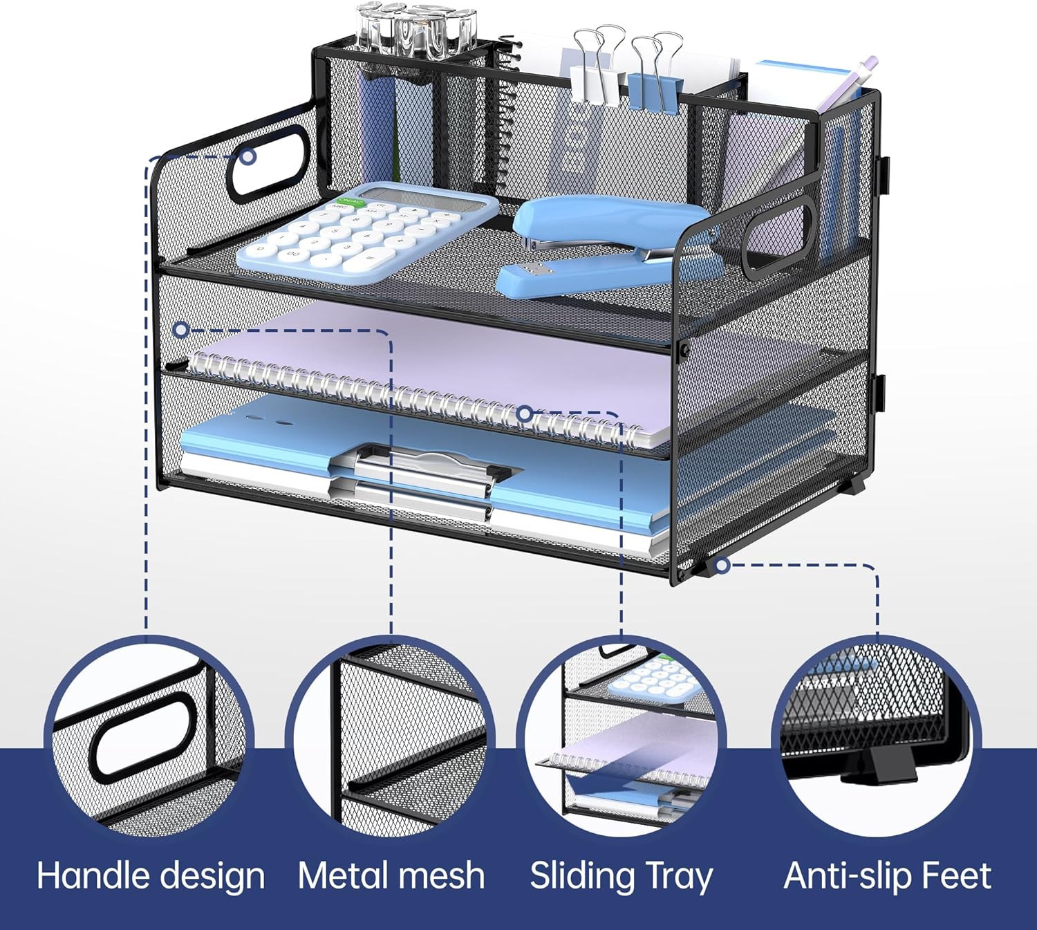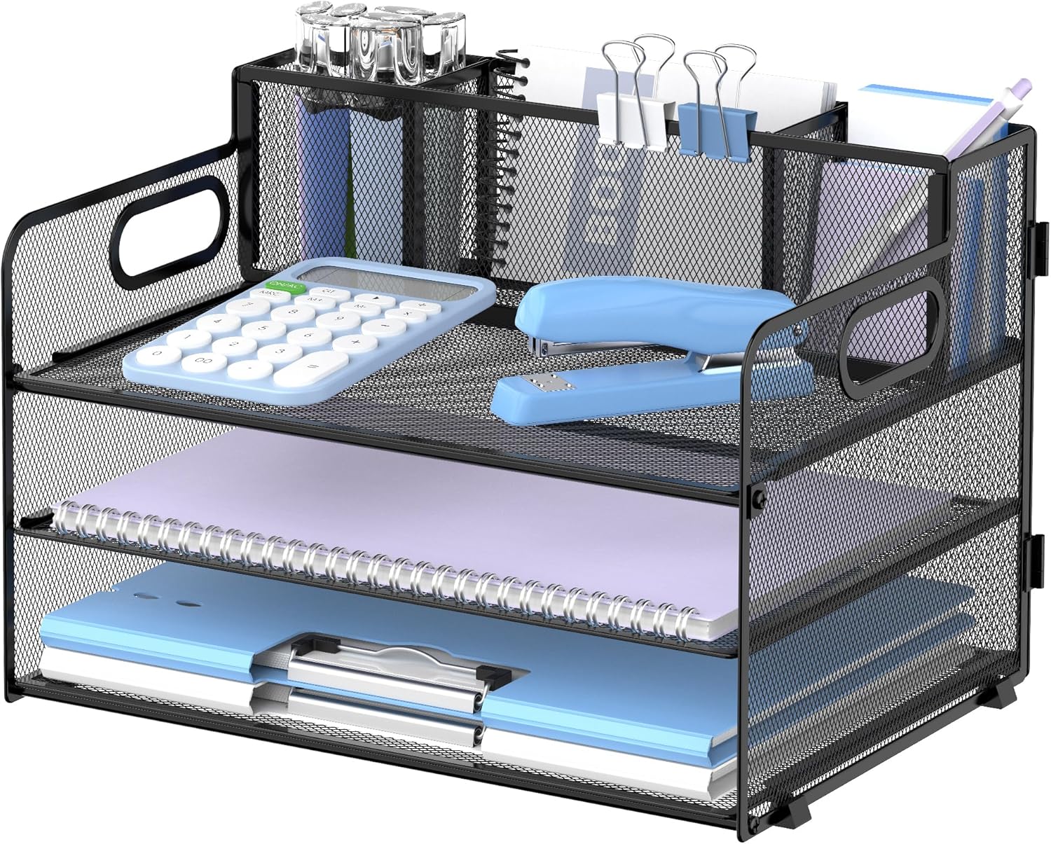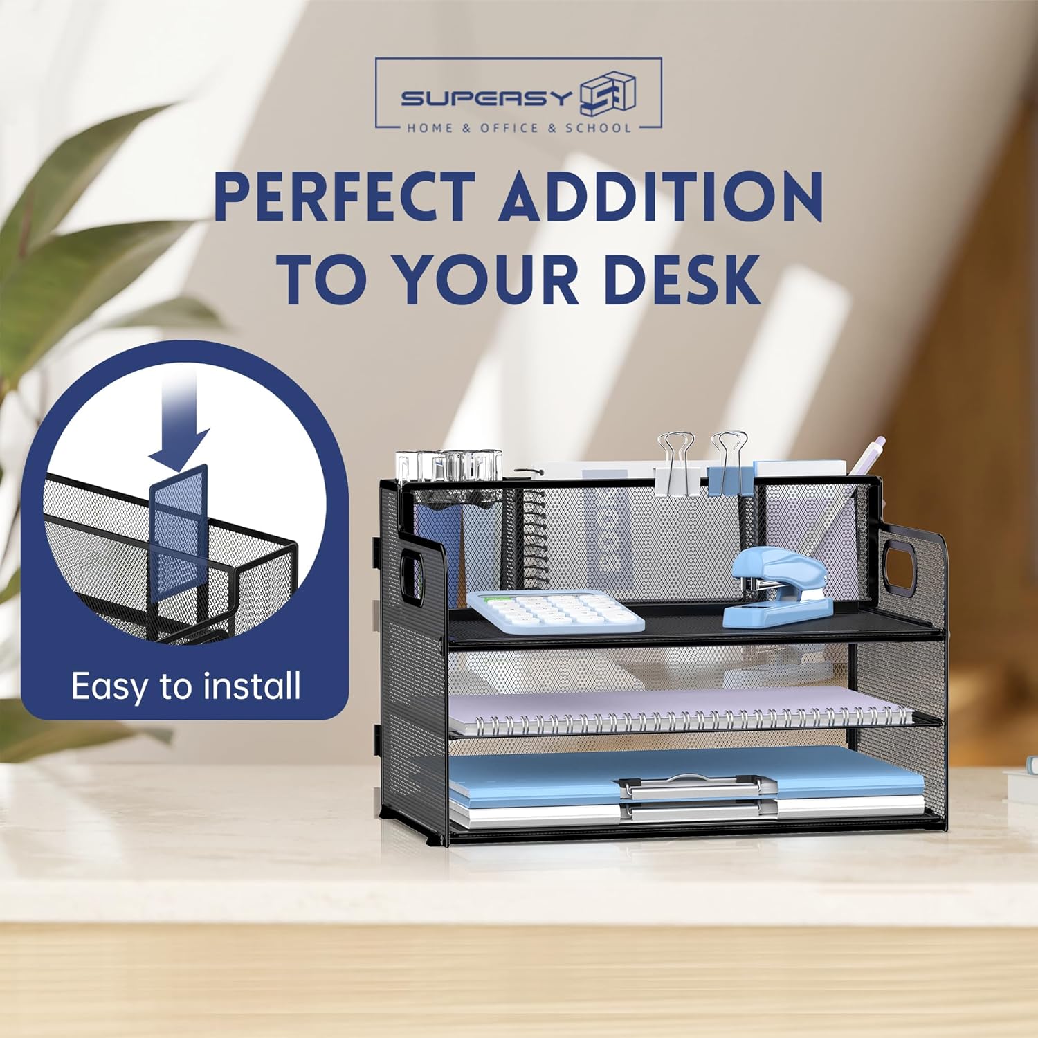 SUPEASY 3 Tier Desk Organizer with Handle & 3 Pen Holders, Mesh Paper/File Organizer for Desk, Paper Letter Tray Organizer for Office Supplies (Black)