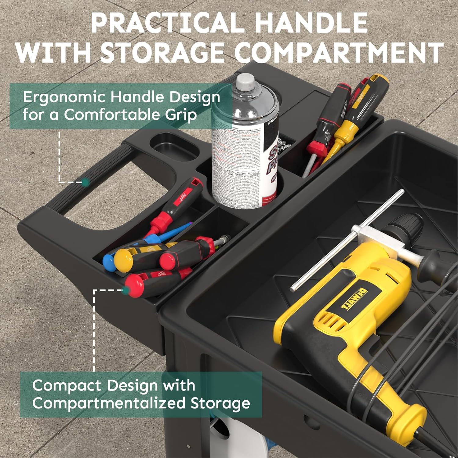- 【Portable Design】Plastic utility service carts are equipped with ergonomic armrests that allow you to move with less effort and experience a comfortable grip. Modular storage compartments and small holes are designed to keep your tools handy and enhance your experience.