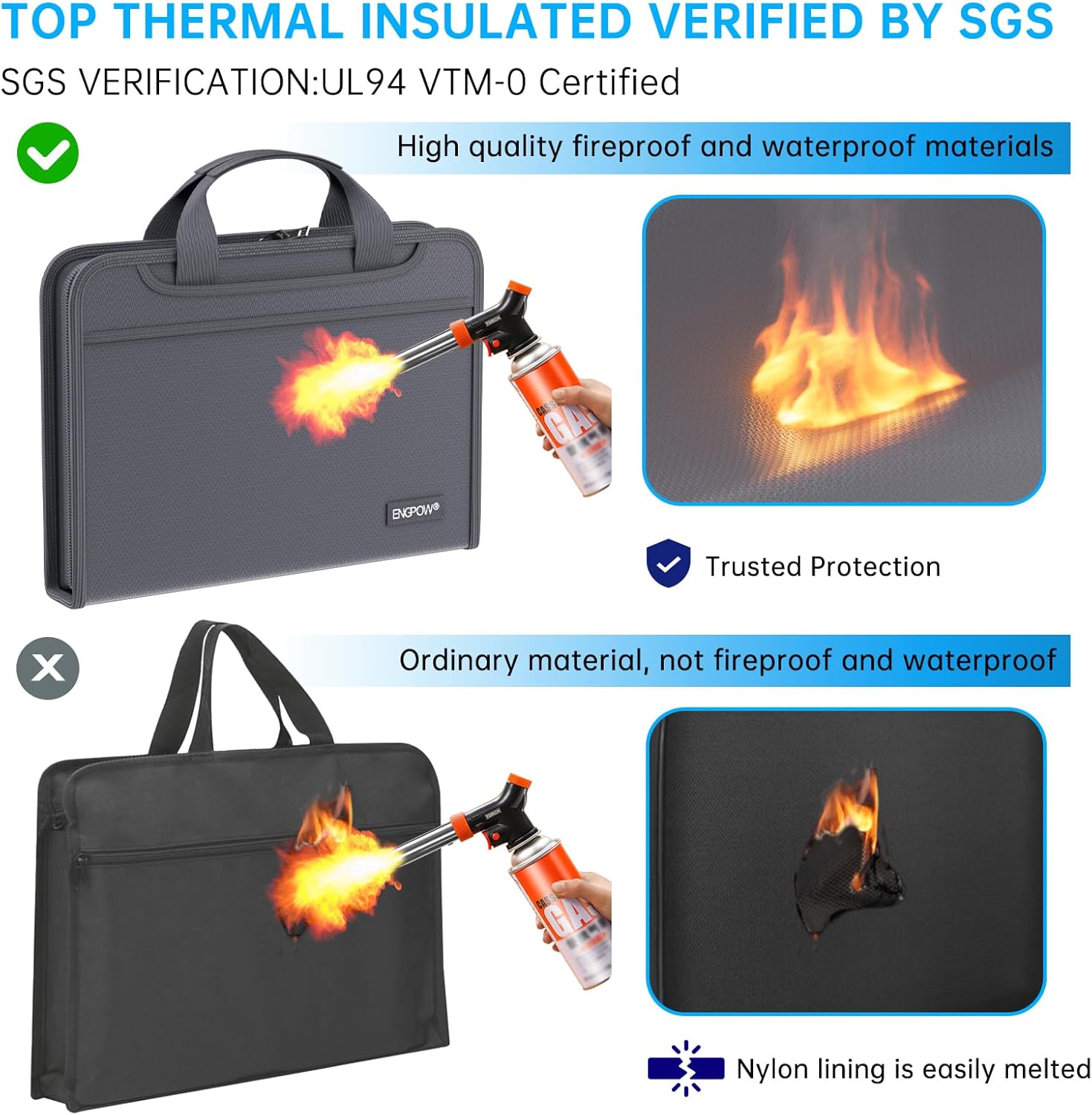 - High-Quality Materials: Protect your files with ENGPOW fireproof accordion file organizer.It is made of 3-layered non-itchy silicone-coated fiberglass which withstand the temperature up to 2200℉.It has been passed by SGS TEST(UL94 VTM-0 Certified).Fireproof File Folder is fireproof&Water-resistant,which can effectively protect your important documents in a fire,flood,and wet weather. They will further keep your files intact.Giving you time to save your important documents when disaster strikes