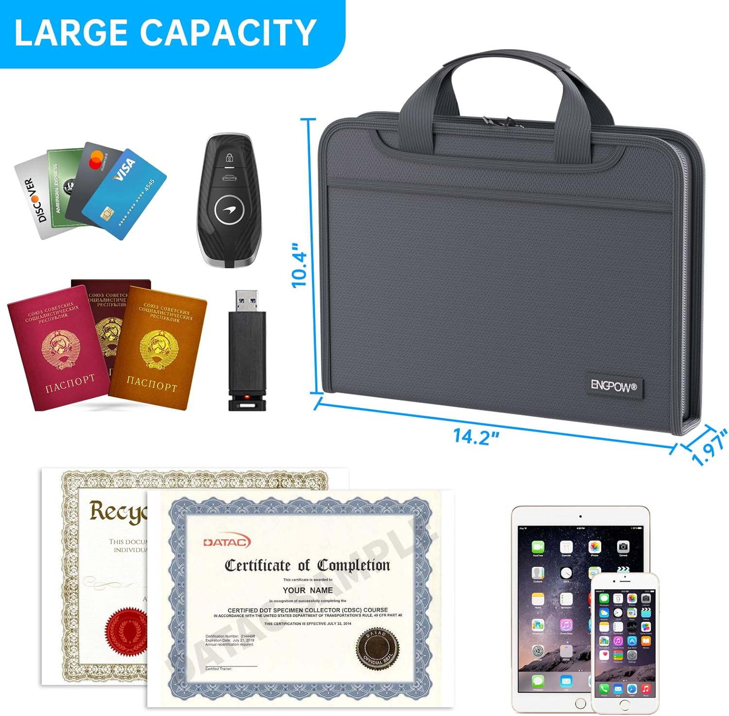- Accordion File Organizer: A Safe Enough Folder to Keep Your Files. Say goodbye to cluttered files and disorganization with ENGPOW's file organizer folders. Compared with other folders,our fireproof folders is allows you to neatly store and classify letter/A4 files, receipts, cards, USB drives, pen, passports and more in a safe and orderly way. Perfect for daily file filing and storage.The Non-dusty material can prevent dust from sticking to the outside of our folder,always keep it neat and tidy.
