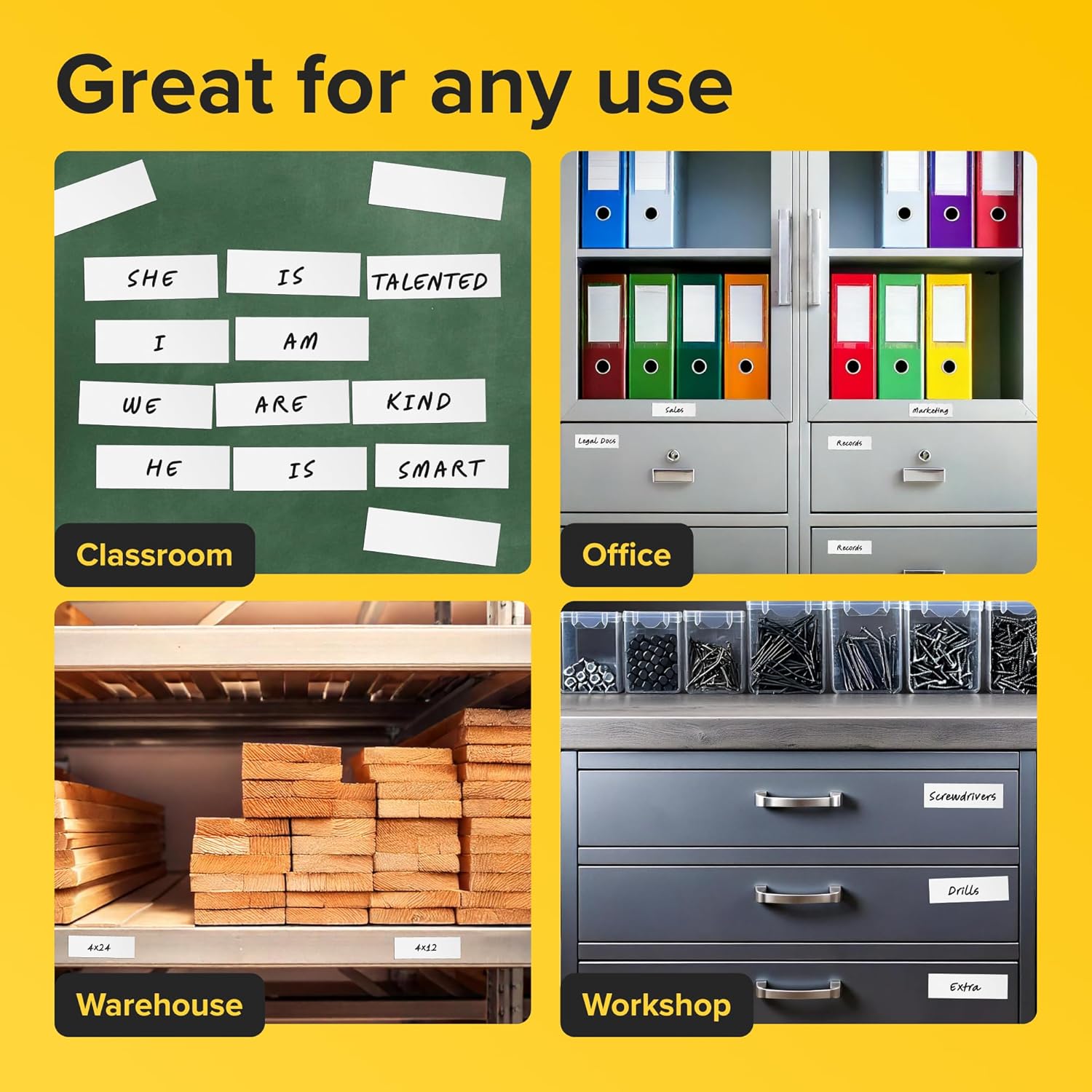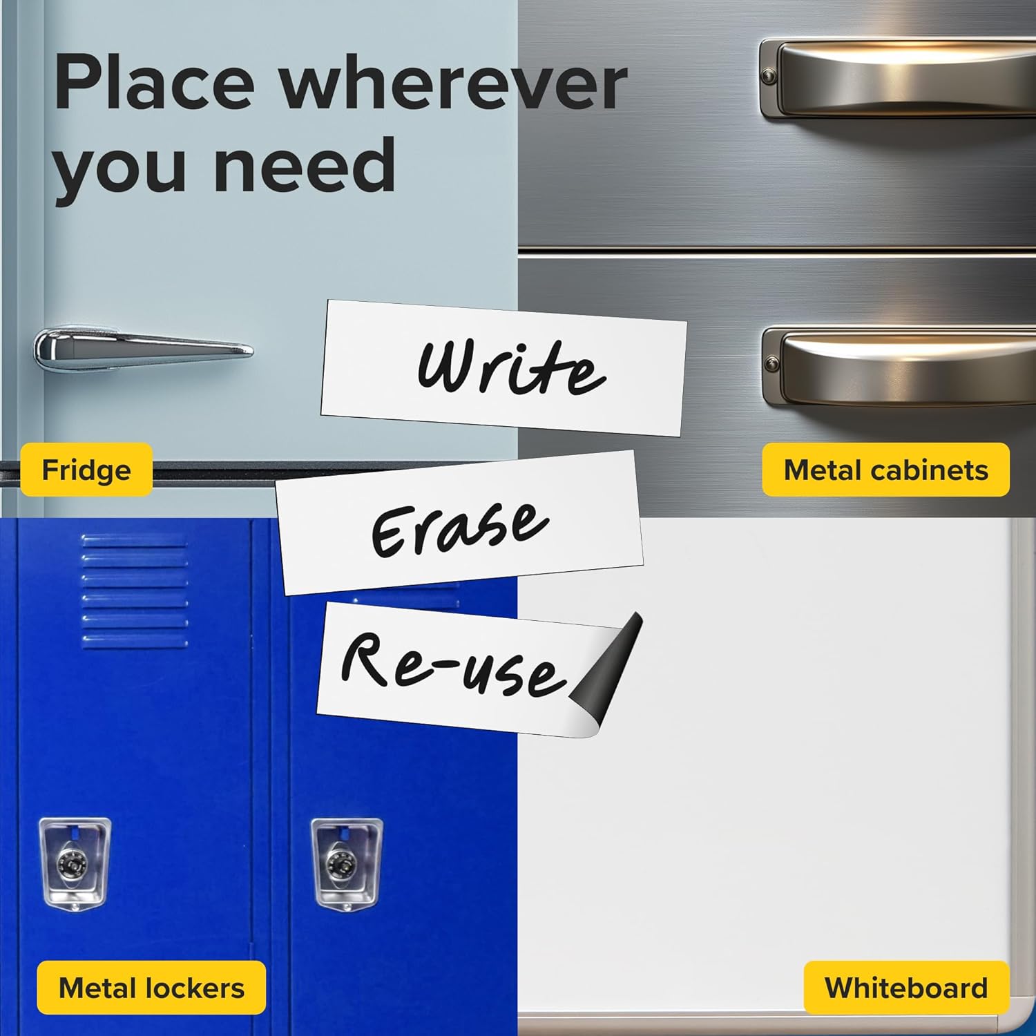 - β EASY TO CUT, INSTALL and REUSABLE writable magnetic accents stickers. Write on them with a dry erase marker, wipe them off and use them again. Dry erase magnetic tape use for labeling storage shelves, labeling cabinets, whiteboards, magnet labels on the refrigerator, toolboxes, teaching aids, message boards, stockroom shelf labels, menu boards, planning boards, file cabinets, refrigerators, retail signs, and every other magnetic surface