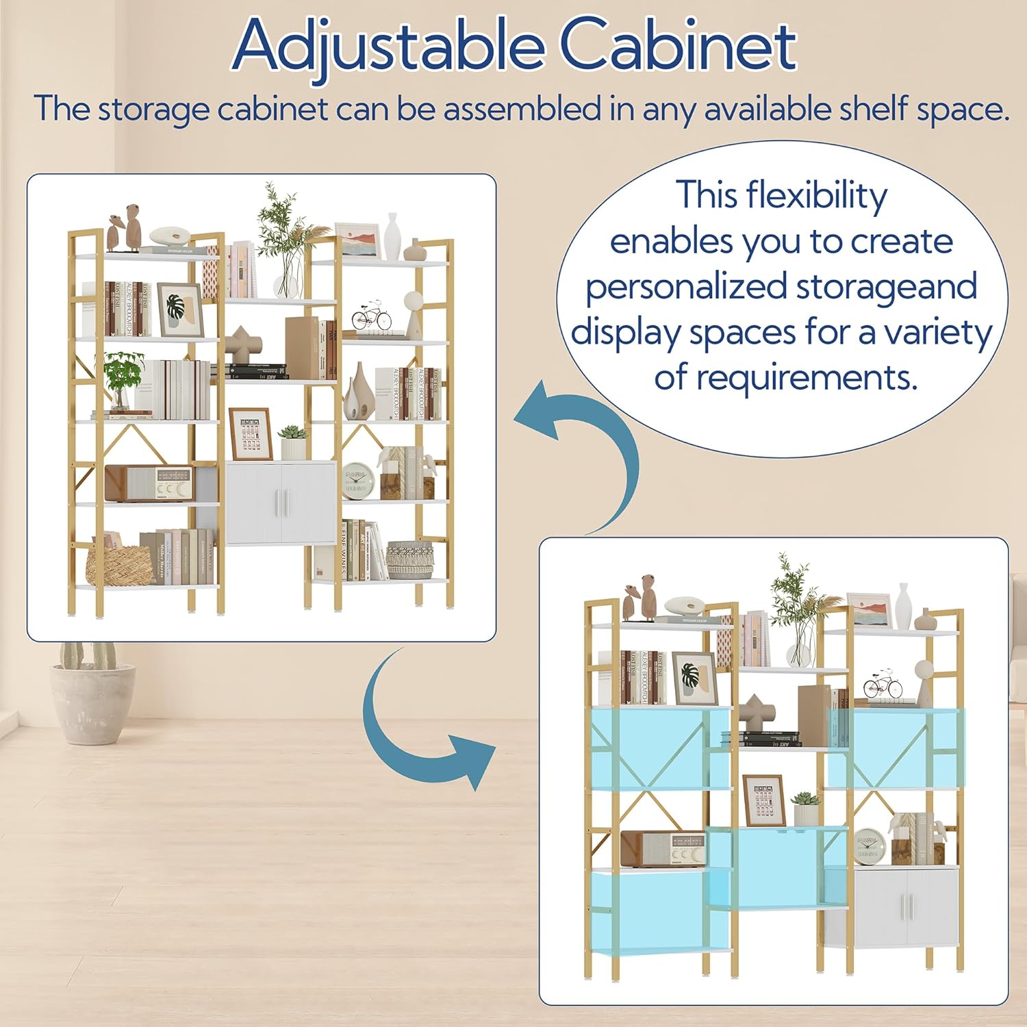 Yusong Bookshelf Triple Wide 5 Tier Bookcases with Storage Cabinet, Industrial Large Modern Tall Bookshelves with 12 Open Display Shelves for Living Room Office Bedroom, White and Gold