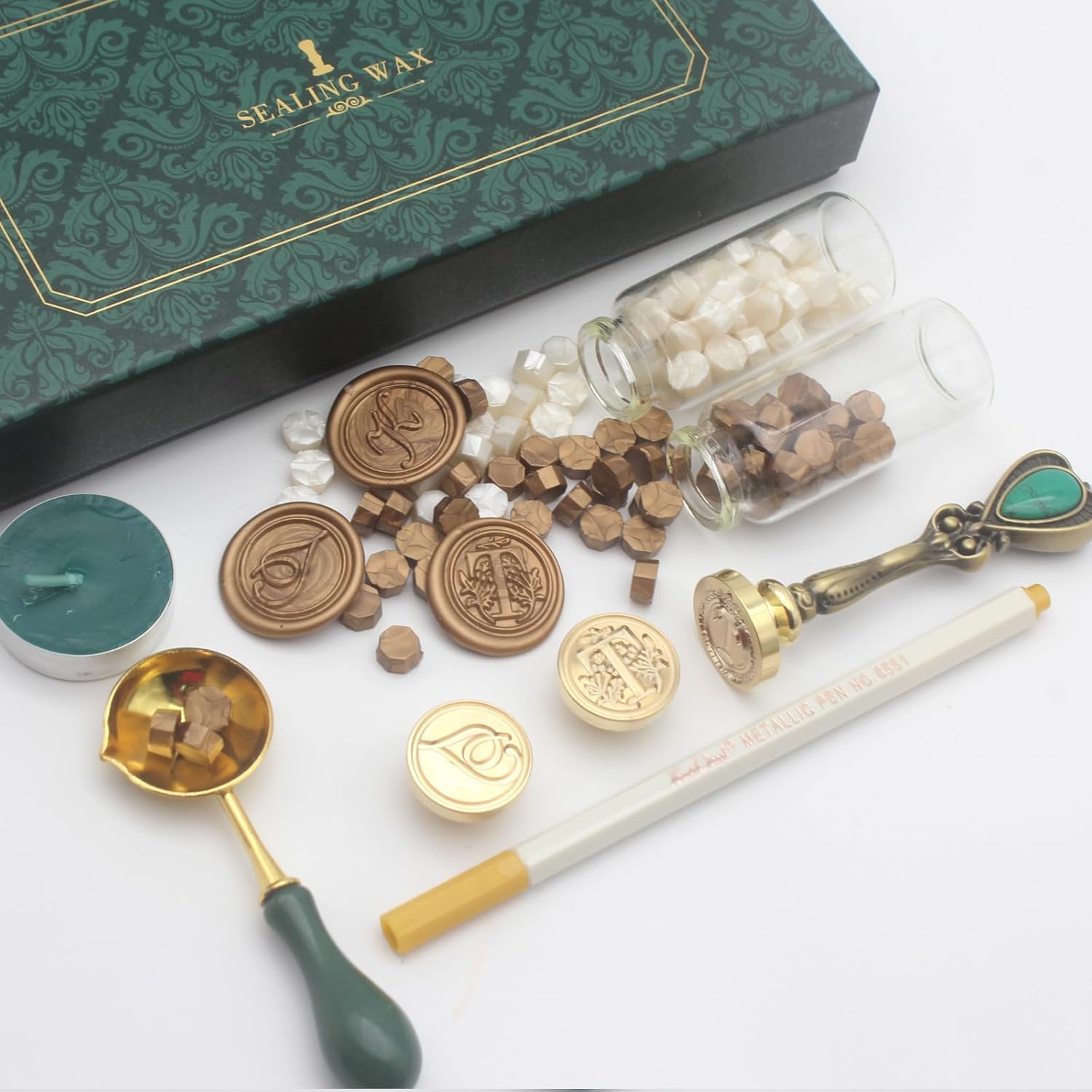 - Vintage Gift Box Wax Seal Stamp Kit: The complete wax seal kit comes with 3 unique initial alphabet sealing wax stamp brass head G in handwritten, crown pattern and iris pattern styles, 1pcs vintage metal handle that allows for easy head replacement, 2 bottles of wax seal beads in preal white and antique gold colors (appr. 80pcs per bottle), a wax seal spoon, a gold wax seal pen for coloring the seals, and a vintage-inspired ink green gift packaging box