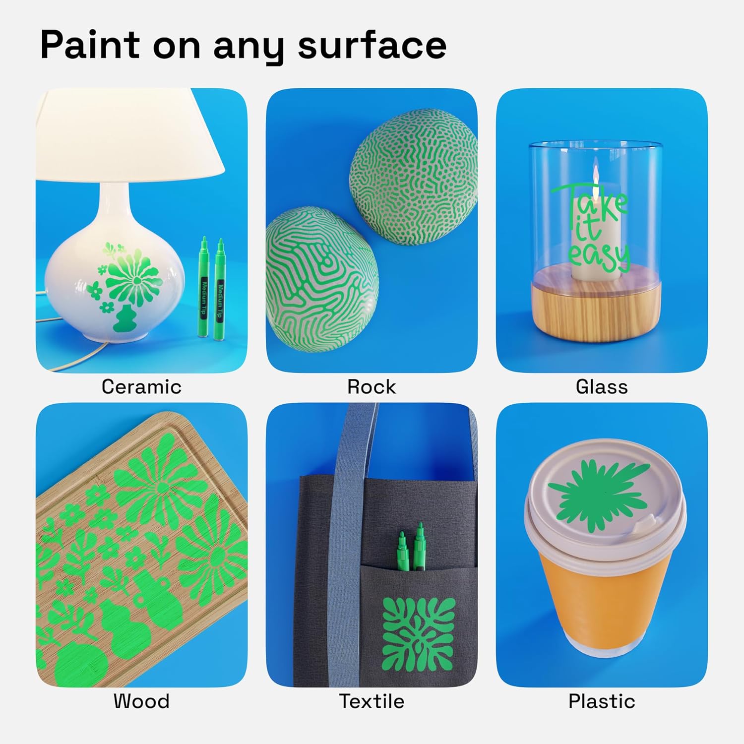 - PREMIUM QUALITY: This Artistro 2-pack of medium fine green acrylic paint pens utilizes vivid, acrylic ink that dries quickly to produce a durable opaque and glossy finish on any surface. Each acrylic paint pen is equipped with Italian ink and a durable Japanese nib.