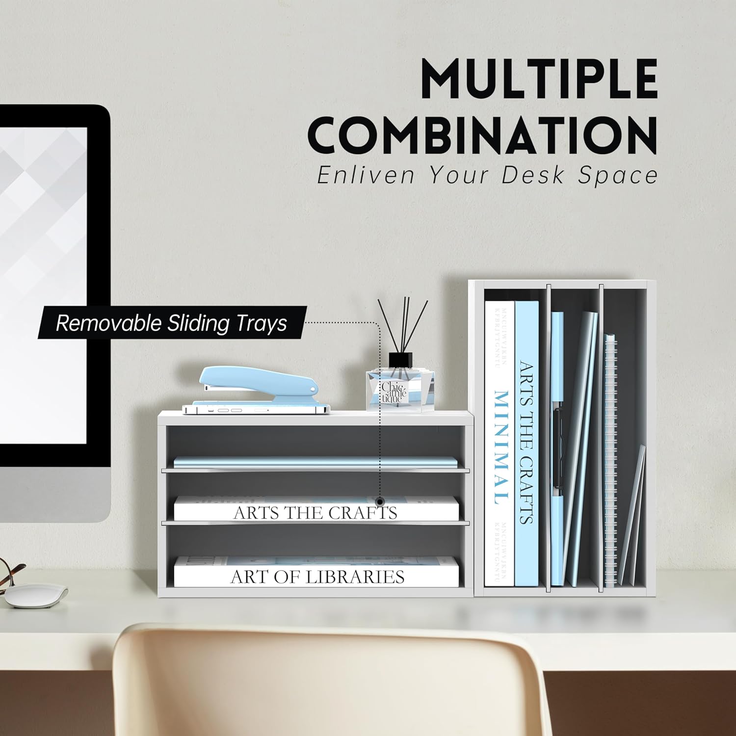 - [Flexible Desk Storage] The shelves of this wooden desk shelf for top of desk are adjustable to meet your personal needs. You can put it horizontally for standard documents, vertically as a book organizer or upright as a tub file bin. This desk file organizer is also a stackable paper tray. You can create more space by stacking this mail holder.