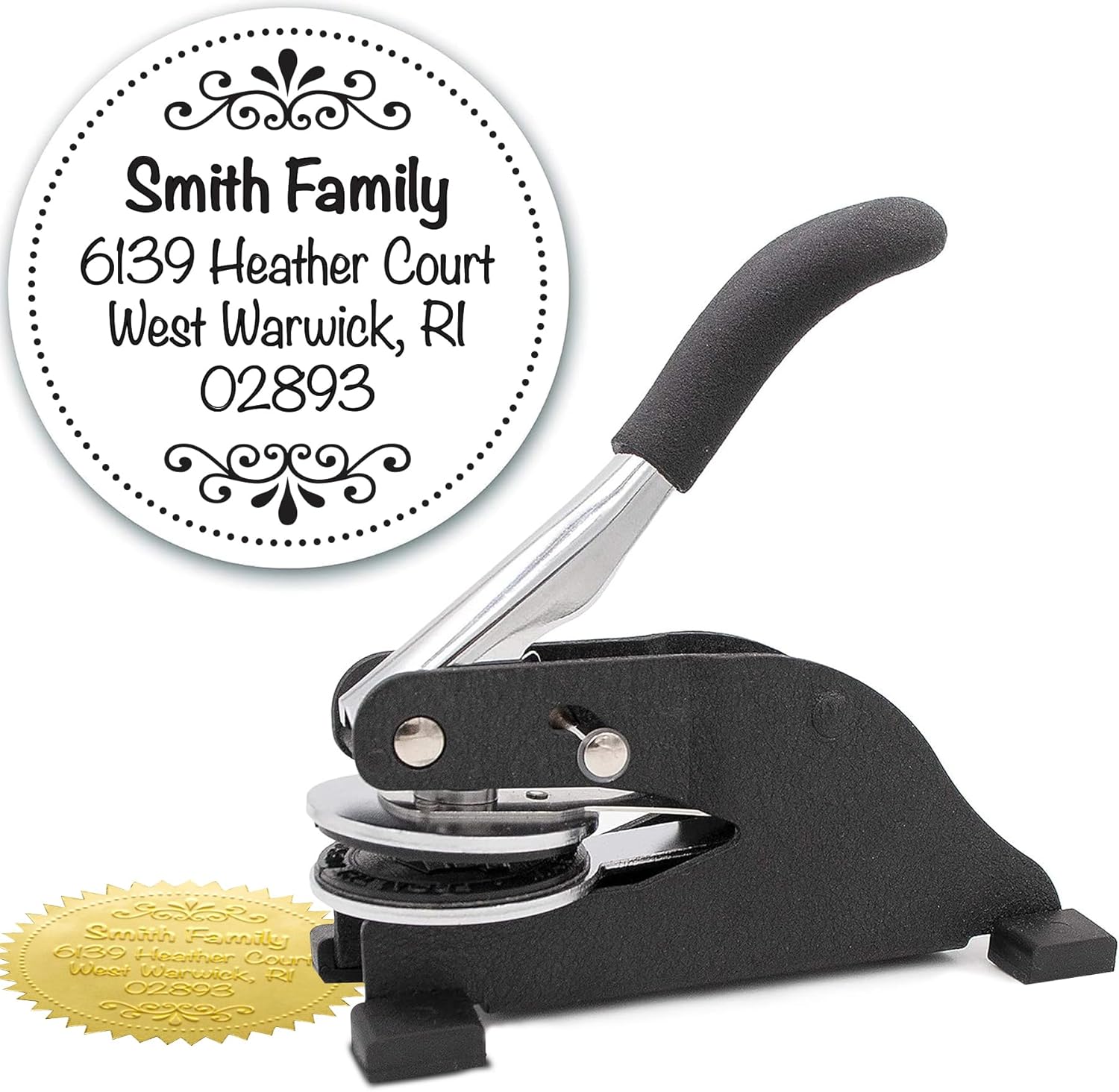 Custom Monogram Address Desk Embosser - Personalized Round Seal with 50 Gold Seal Labels - Style EMD-027