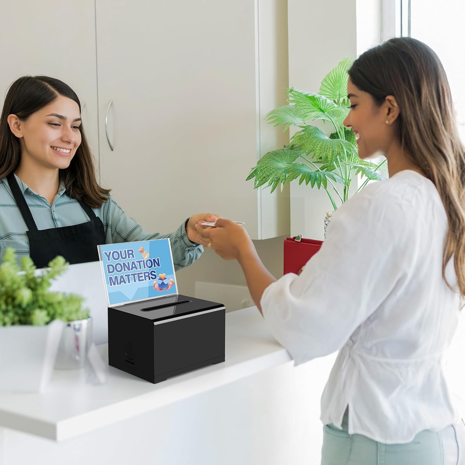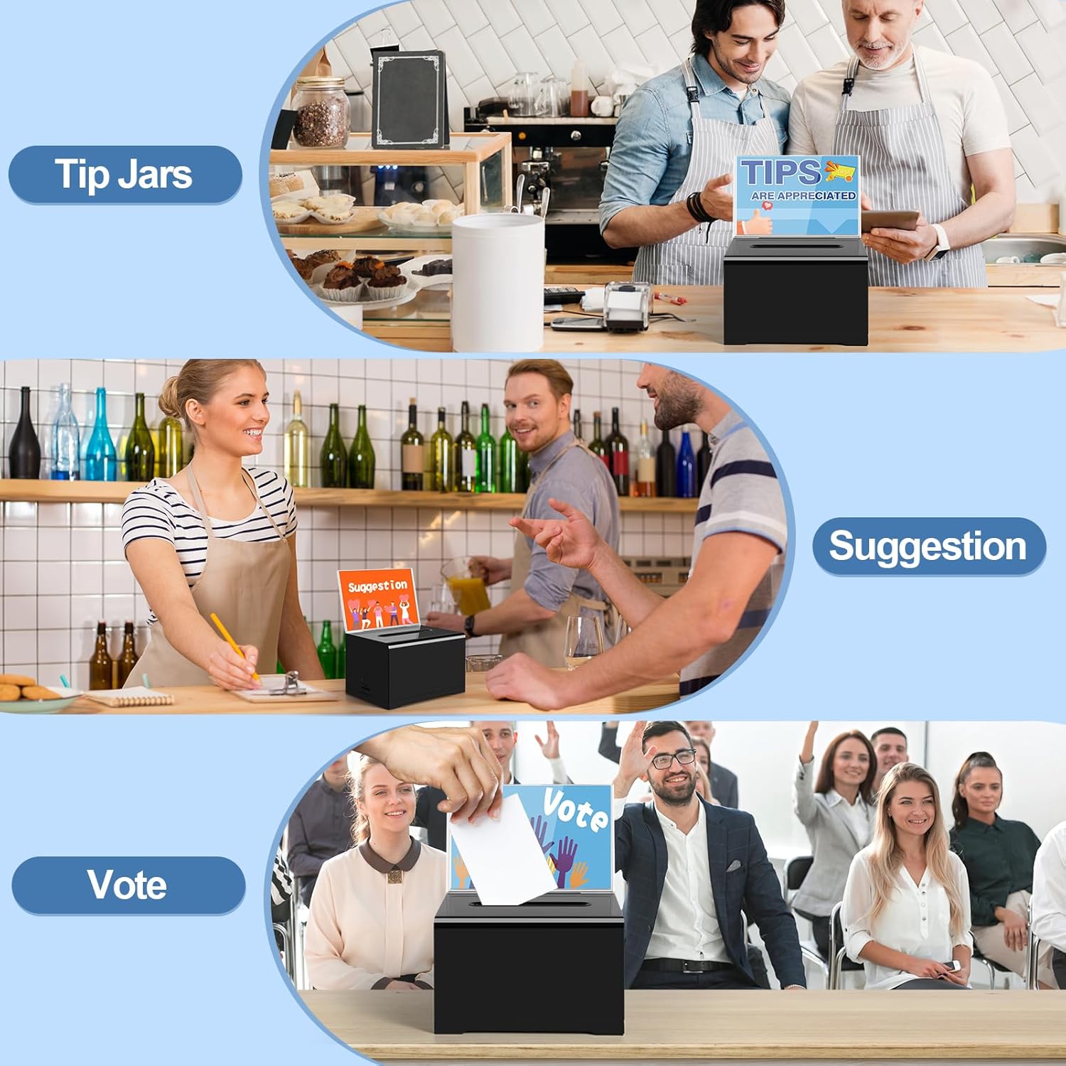 - 【Versatile Applications】 Our donation box serves multiple purposes - perfect for fundraising, collecting opinions, receiving suggestions, and more. It functions equally well as a donation box or suggestion box. Ideal for offices, schools, community centers, coffee shops, and various commercial environments, tips and donations help encourage customers and team members to tip, provide feedbacks / business cards,this versatile tool meets diverse needs.