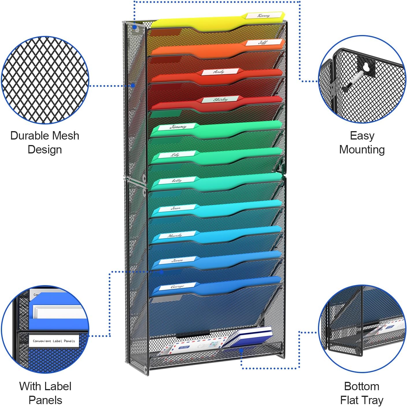 samstar 12 Tier Wall File Organizer, Hanging Wall Mount File Holder Paper Folder Mail Organizer, Mesh Metal, Black.
