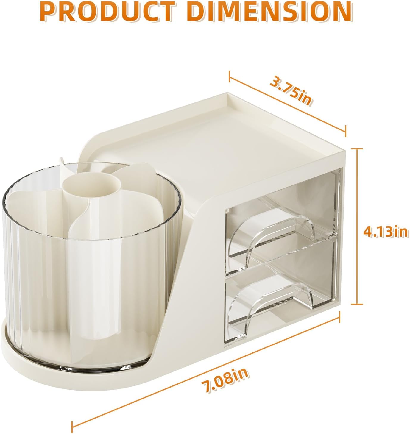 - 【Unique Design】: This desktop organizer is an all-in-one design blent rotating pen holder and drawer organizer. This gives it a more functional storage performance which is convenient for storing and organizing small items on office desks, at home, on vanity, and so on, helping you to save space, and make your desk look more neat and clean