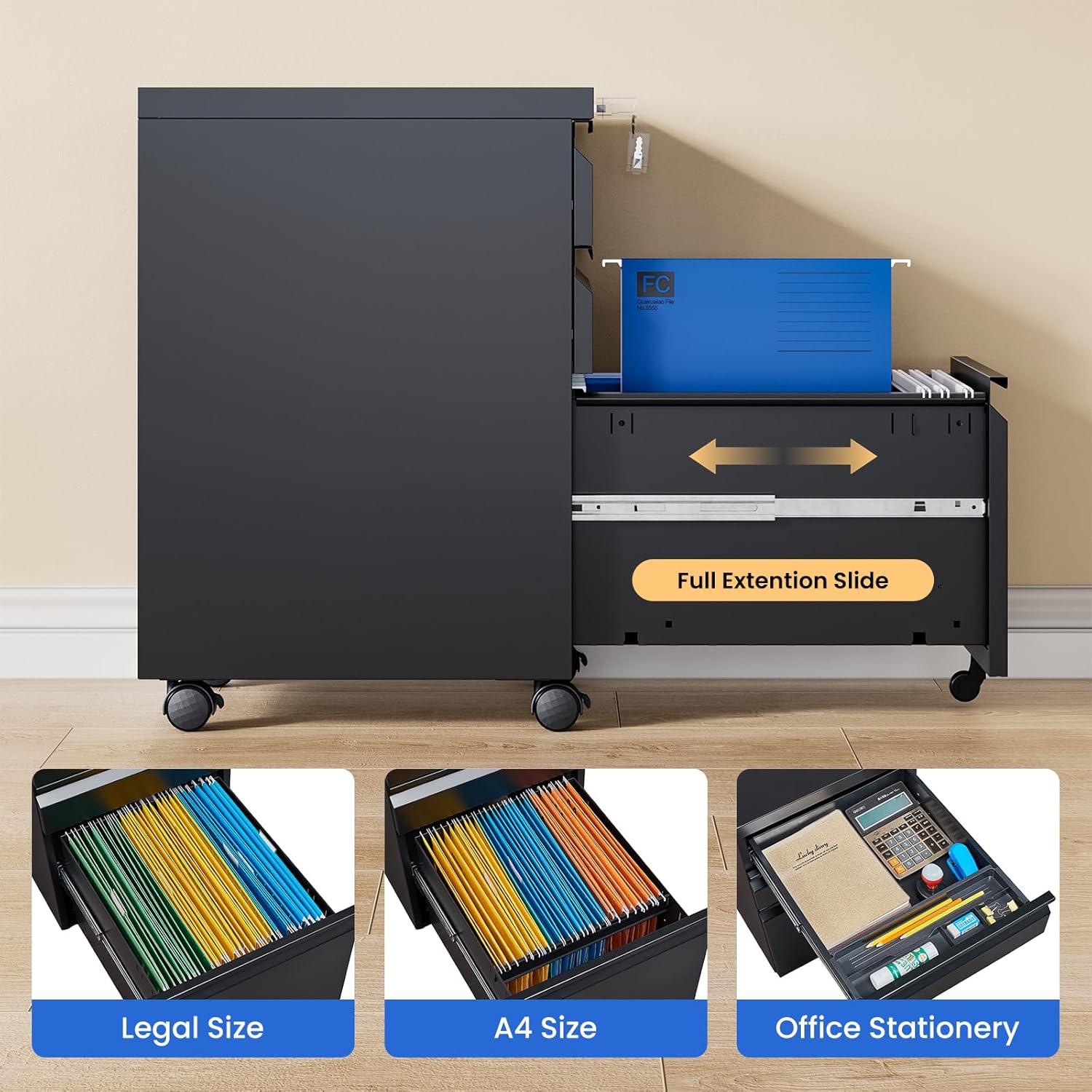 - 【3 Drawer Filing Cabinet】: 3 drawers storage with removable pencil trays and adjustable hanging bars which can hold letter, legal, and A4 size hanging files. Two shallow drawers are the ideal size to store stationery of different types.