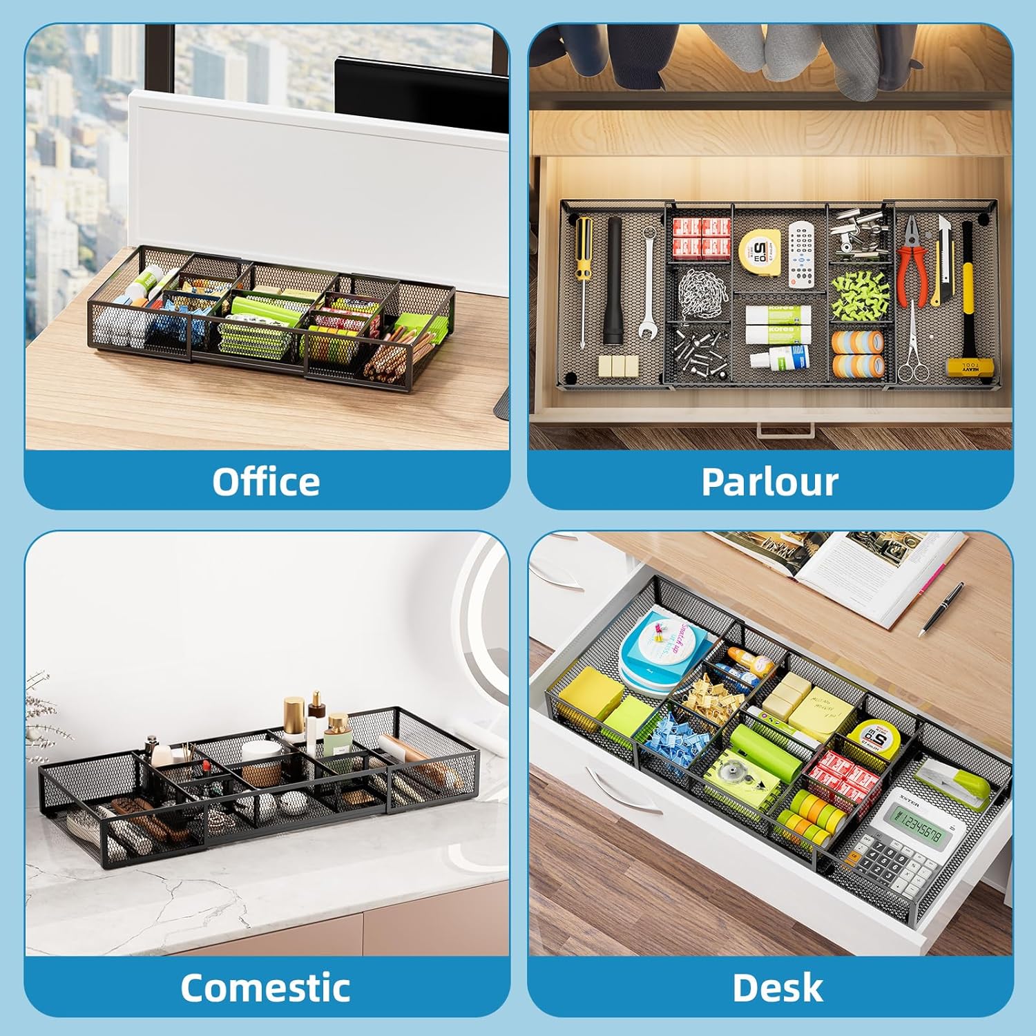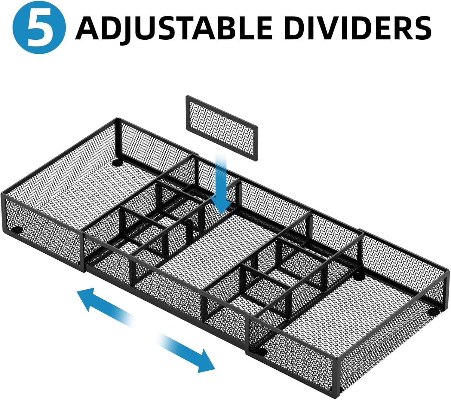 Marbrasse Expandable Desk Drawer Organizer, Mesh Drawer Organizer Tray with 10 Adjustable Compartments, Desk Organizers and Accessories for Office Supplies (Longer Expandable Drawer Organizer-B)