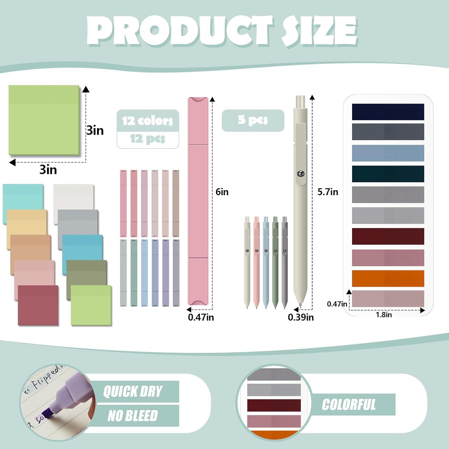 Jutom 38 Pcs Book Annotation Kit Aesthetic Highlighters Gel Pens Set Sticky Notes Tabs Markers Dual Ended Highlighter Quick Dry Ink Pens for Office Annotating Books(Earth Tones,Square)