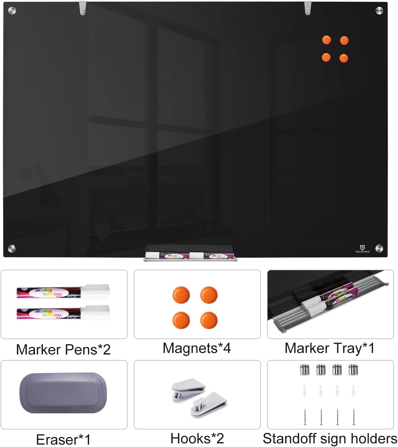TSJ OFFICE Glass Dry-Erase Board - 36 x 24 Inches Wall Mounted Black Glass Magnetic Whiteboard, Frameless Large White Board for Office, Home & School