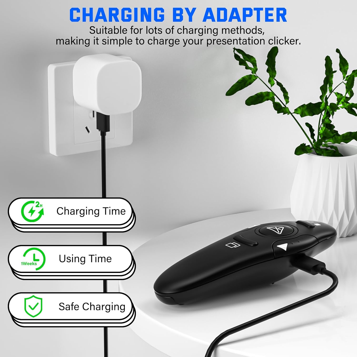 - RECHARGEBLE PRESENTATION REMOTE: The presentation clicker built-in lithium battery, so that you don't worry about when going out to make a speech, the wireless presenter has no electricity to delayed the speech. The clicker charging port is TYPE-C port, so that you can quickly find a suitable charger for charging it even when the electricity is out of the speech. Powerpoint clicker with battery capacity is 230mAh, the charging time is 2 hours, the using time is 2 weeks