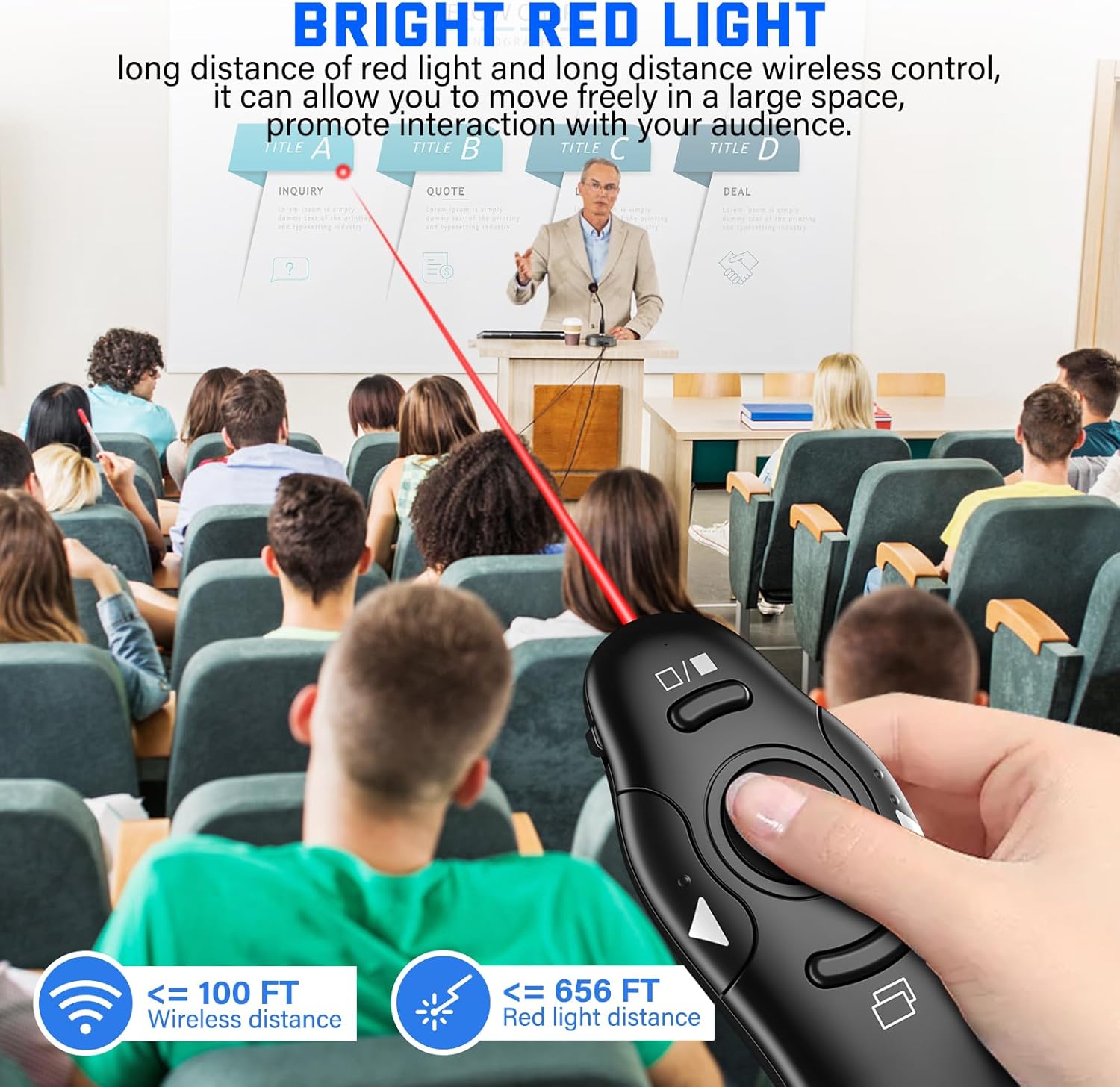 - 100FT WIRELESS DISTANCE & 656 LIGHT DISTANCE: Powerpoint clicker supports page up/down, full/black screen and volume control. Wireless range up 100FT, which can allow you freely walk around and operate during the presentation, interact with your audience better. The red light range up 656FT, which can be easily to seen in most backgrounds, and it is easy to point out key areas to get the audience's attention. Clikcer for classroom/meeting/speeching(Not recommended for TV/LED/LCD screens)