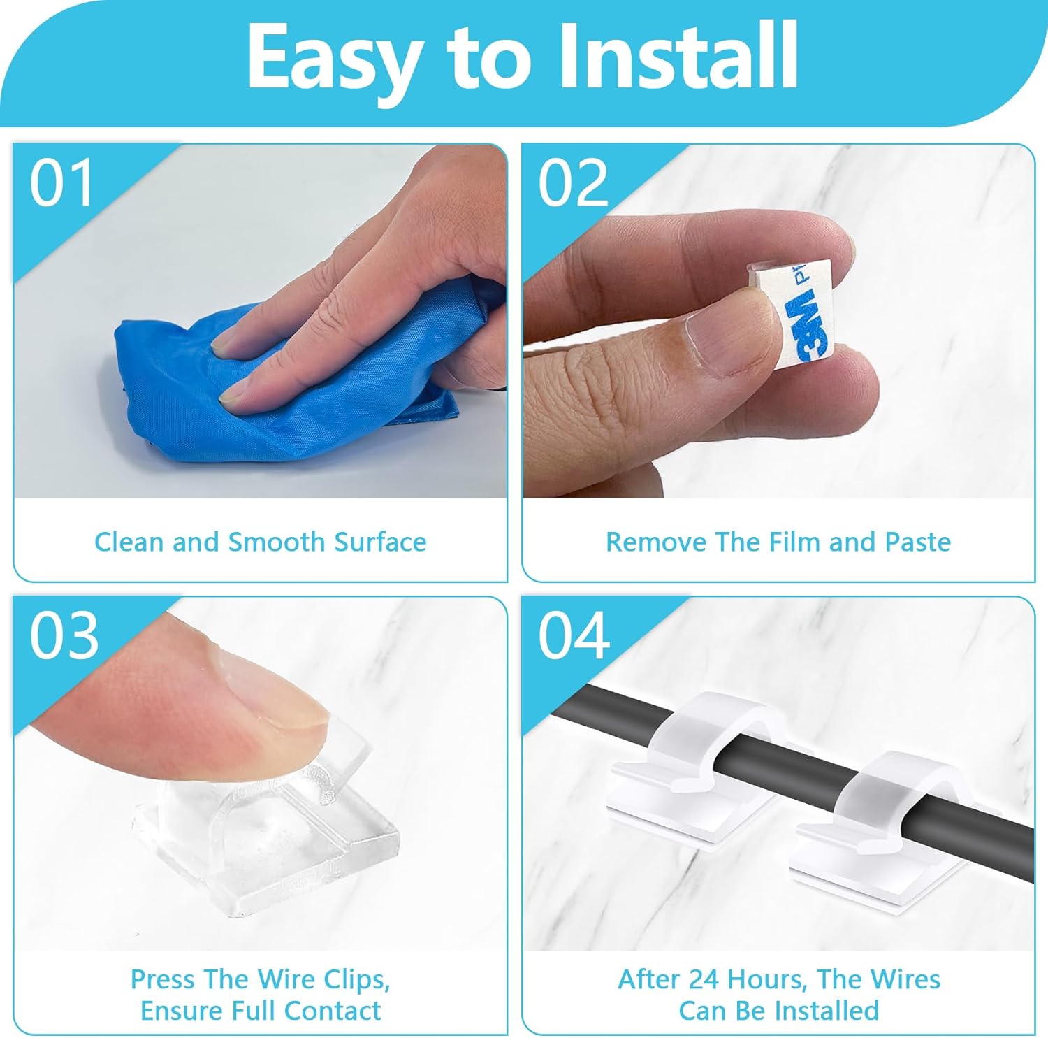 - 【Warm Tips】 Make sure to clean the mounting surface with alcohol pads before you use the wire holder clips, stick them on and press firmly for 30 seconds, and use them after 24 hours for maximum adhesion. As the adhesive is very strong, it is recommended that you use a tool to remove the wire clip, such as a shovel. There will be no residue after removal.