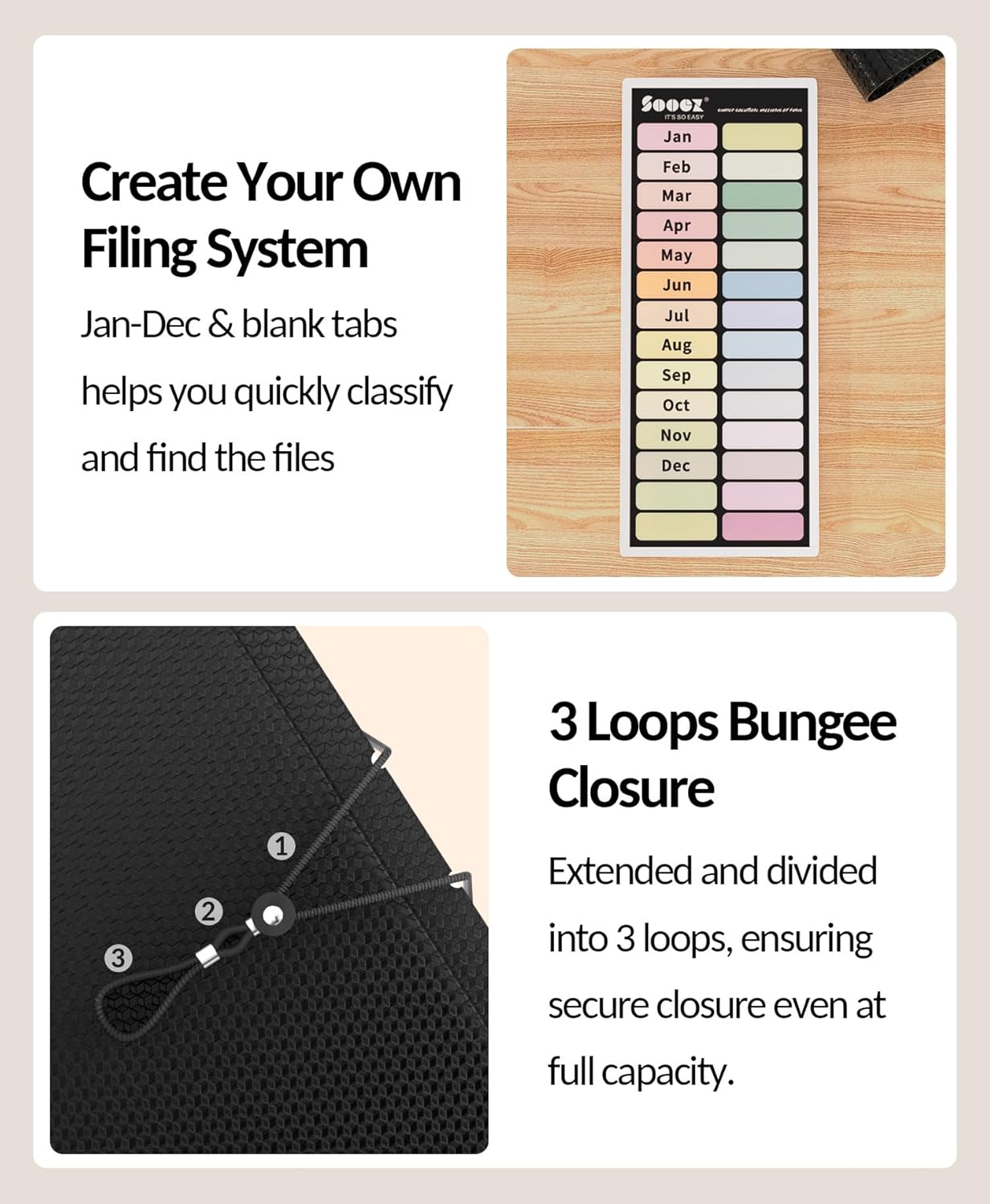 - Sticky Labels & 3 Loops Bungee Closure: Colorful monthly tabs and labels help you locate the target object at a glance and manage monthly tasks with ease. The elastic band closure with three loops expands generously to accommodate all your storage needs