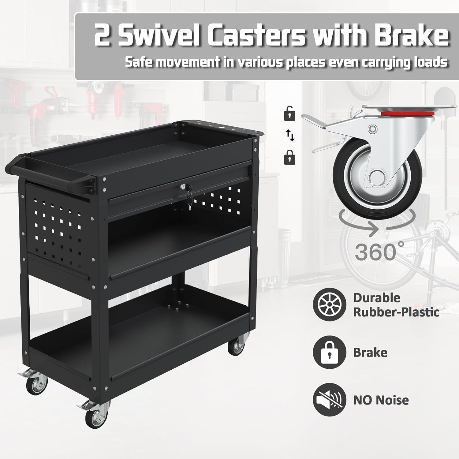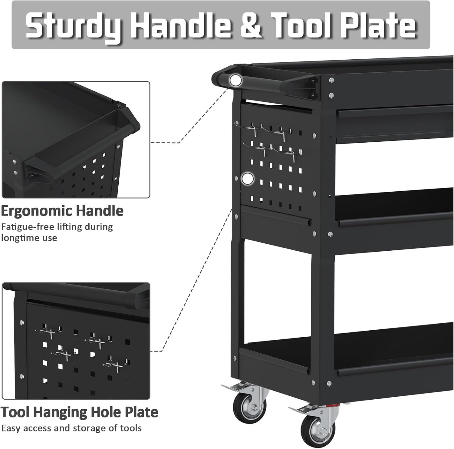 3 Tier Rolling Tool Cart, 400 LBS Capacity Mechanic Tool Carts on Wheels, Heavy Duty Utility Cart with Drawers, Metal Work Cart for Garage, Warehouse and Repair Shop, Matte Black