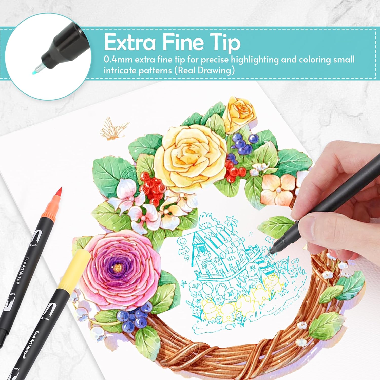 - 🎨 Convenient Dual Tip Paint Markers: Each watercolor marker features two different tips to meet different coloring needs, eliminating the hassle of switching nibs and offering greater convenience for your creations. The 0.4mm fine tip is perfect for sketching outlines and adding details, while the 1-2mm soft brush tip is ideal for shading and quickly coloring large areas in your art projects. Whether you're a beginner or a professional, you can fully unleash your creativity!