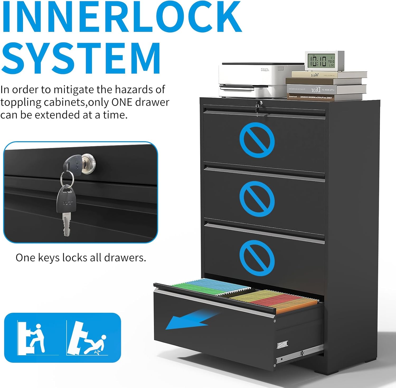 - 【Enhanced Security and Safety】This filing cabinets for home office has one lock and 2 keys, one single lock can secure all the drawers, but interlocking mechanism allows only one drawer to open at a time to add security. Additionally, the anti-tilt device also enhances safety further by fixing the metal filing cabinet to the wall.
