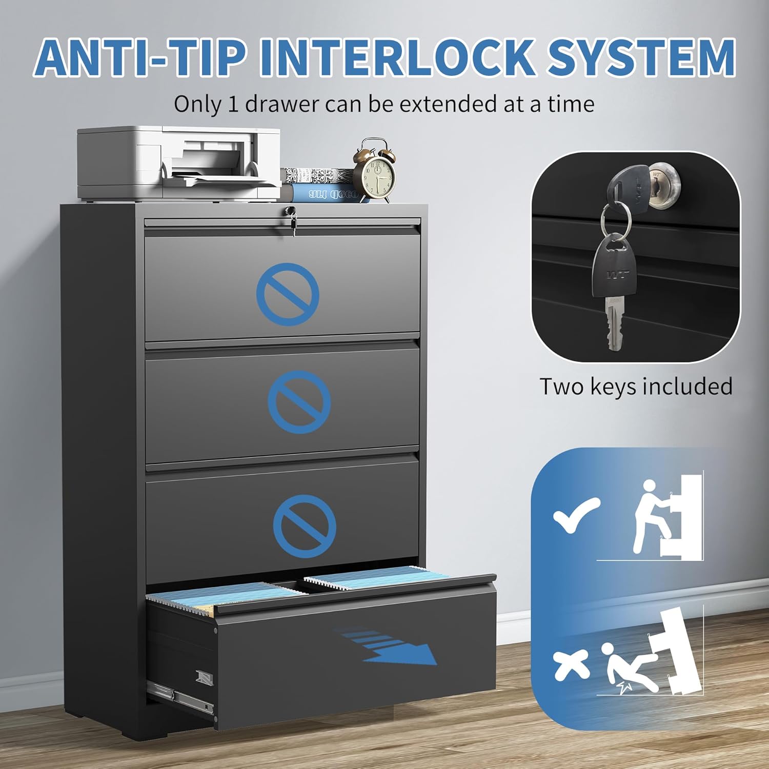 - ăEnhanced Safety Featuresă To prevent tipping hazards, FLIXELIO 4 drawer file cabinet with lock includes a built-in anti-tip mechanism that allows only one drawer to open at a time. This thoughtful design minimizes safety risks and ensures stability, even when multiple drawers are in use.