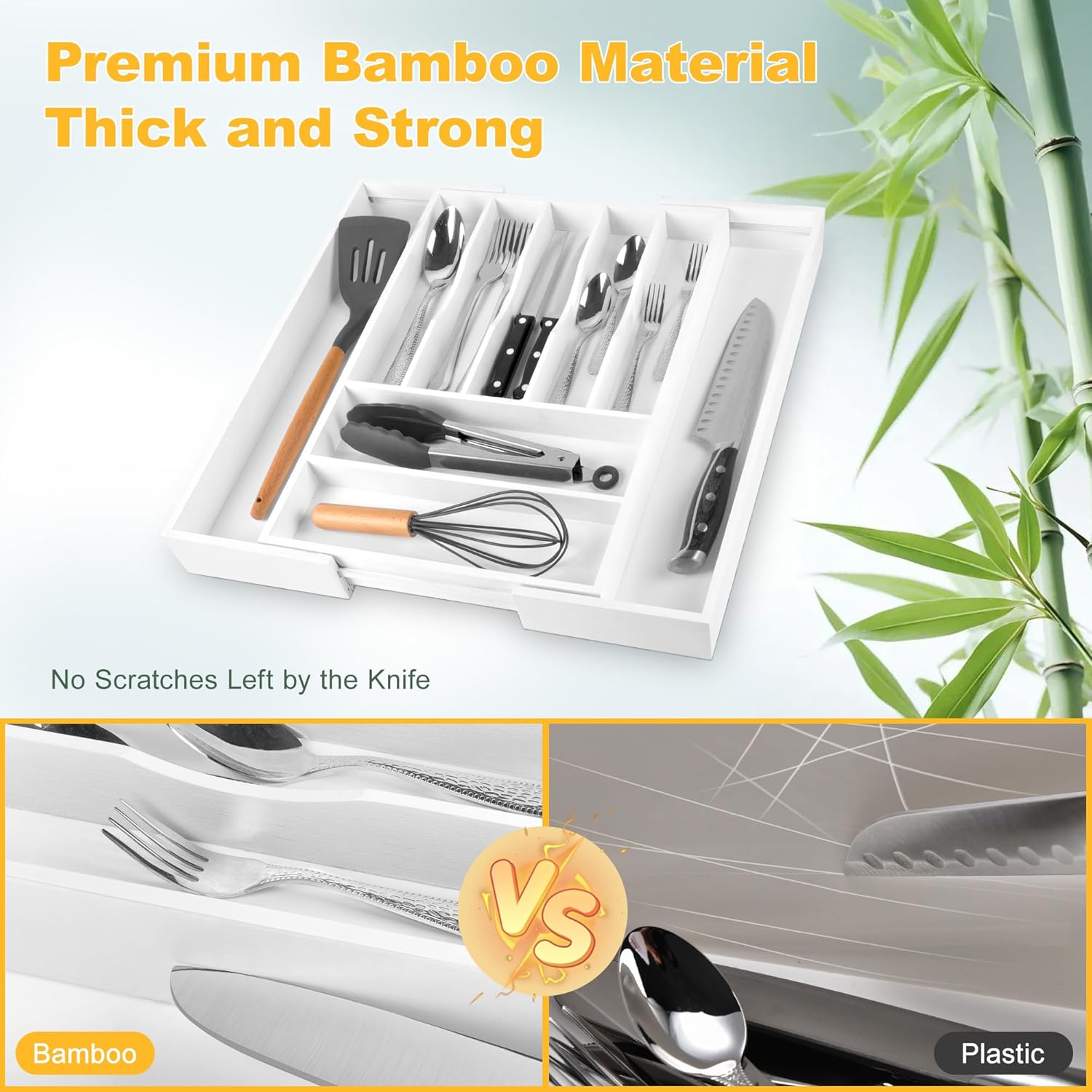 - â ăSturdy and Well-madeăOur silverware tray for drawer is made of minimally refined natural bamboo, a renewable, sustainable source, making them a green choice, with the age of over 4 years, which makes the silverware holder durable enough for long time use. Unlike the plastic and metal drawer organizer, our flatware & utensil is water & odor resistant, the silverware organizing tray is perfect for years of use, especially in kitchens where things can get messy quickly.