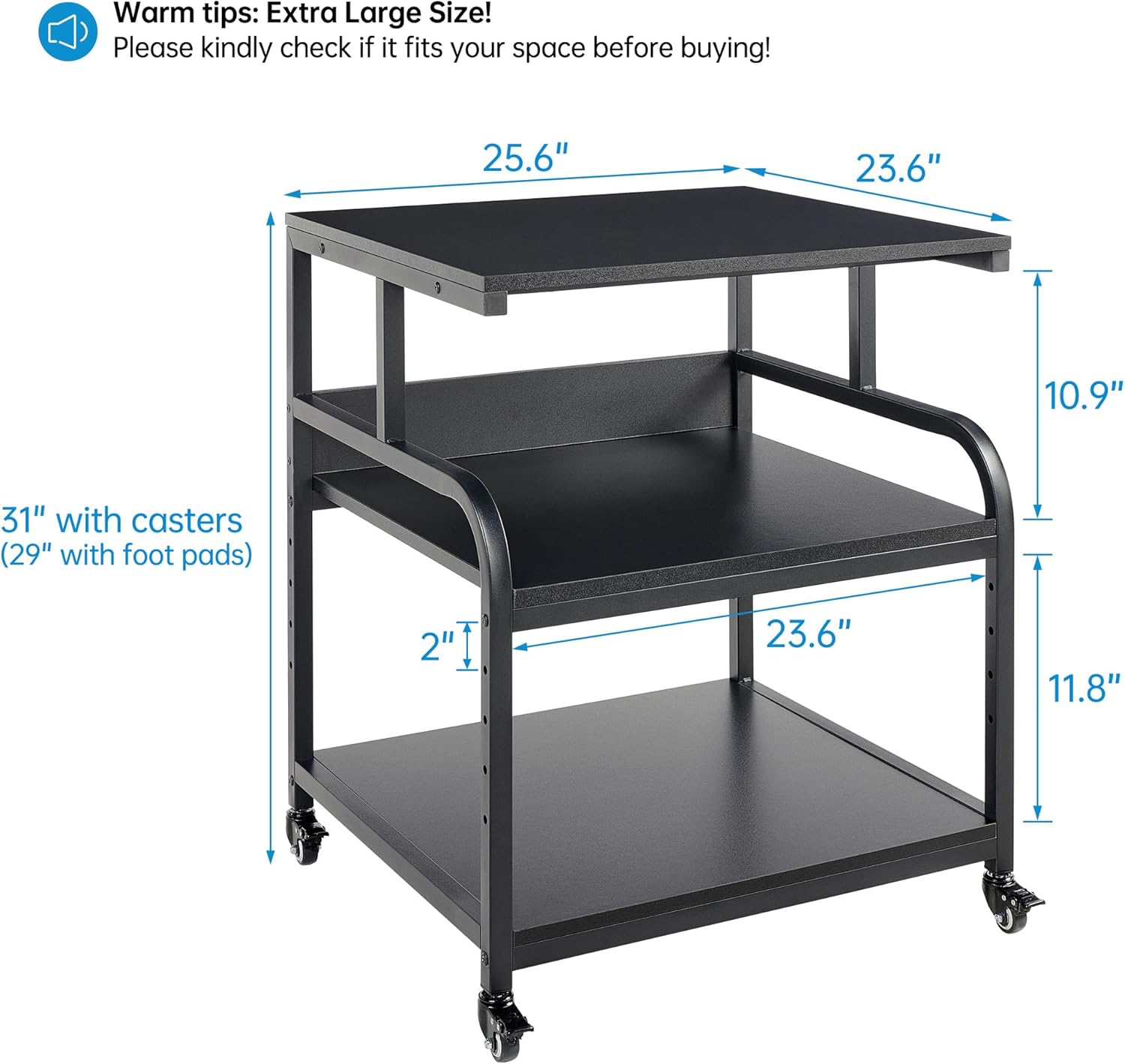 - 【Extra Large Size】With overall product dimensions of 25.6"W x 23.6"D x 29"H/31"H and a weight capacity of at least 100lb on each tier, this stand is designed specially for extra large and heavy printers, scanners and other bulky equipment. Additionally, 3 tier storage shelves offer spacious room for organizing and storing office supplies such as paper, toner, and more, ensuring easy access while working or studying.