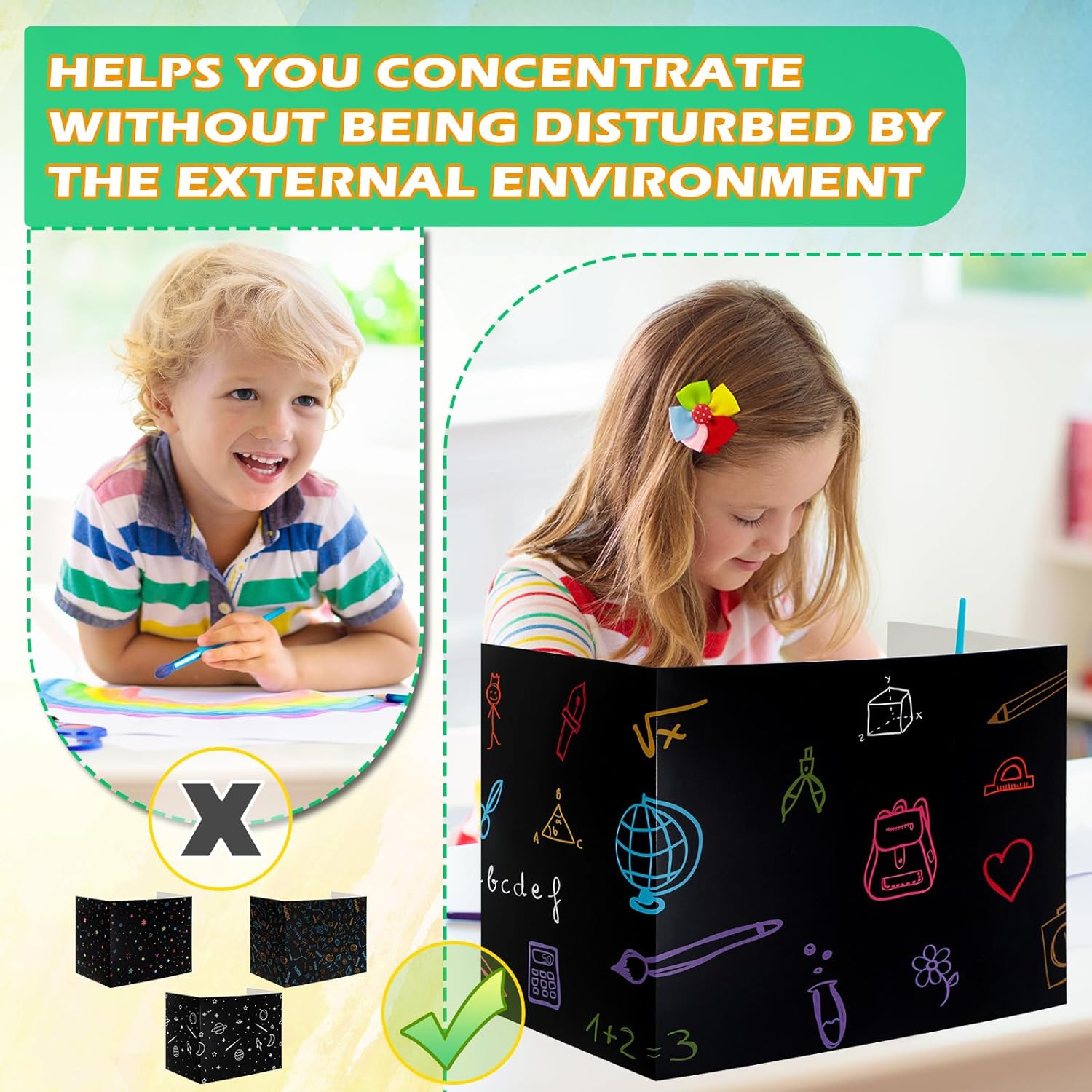 - Focus Attention: the desk dividers for students are high enough to help students focus and reduce distractions; They also make it easy for teachers and parents to monitor children's learning, avoid cheating; Besides, they can help reduce distractions from the classroom and family, and create a quiet, private environment for children