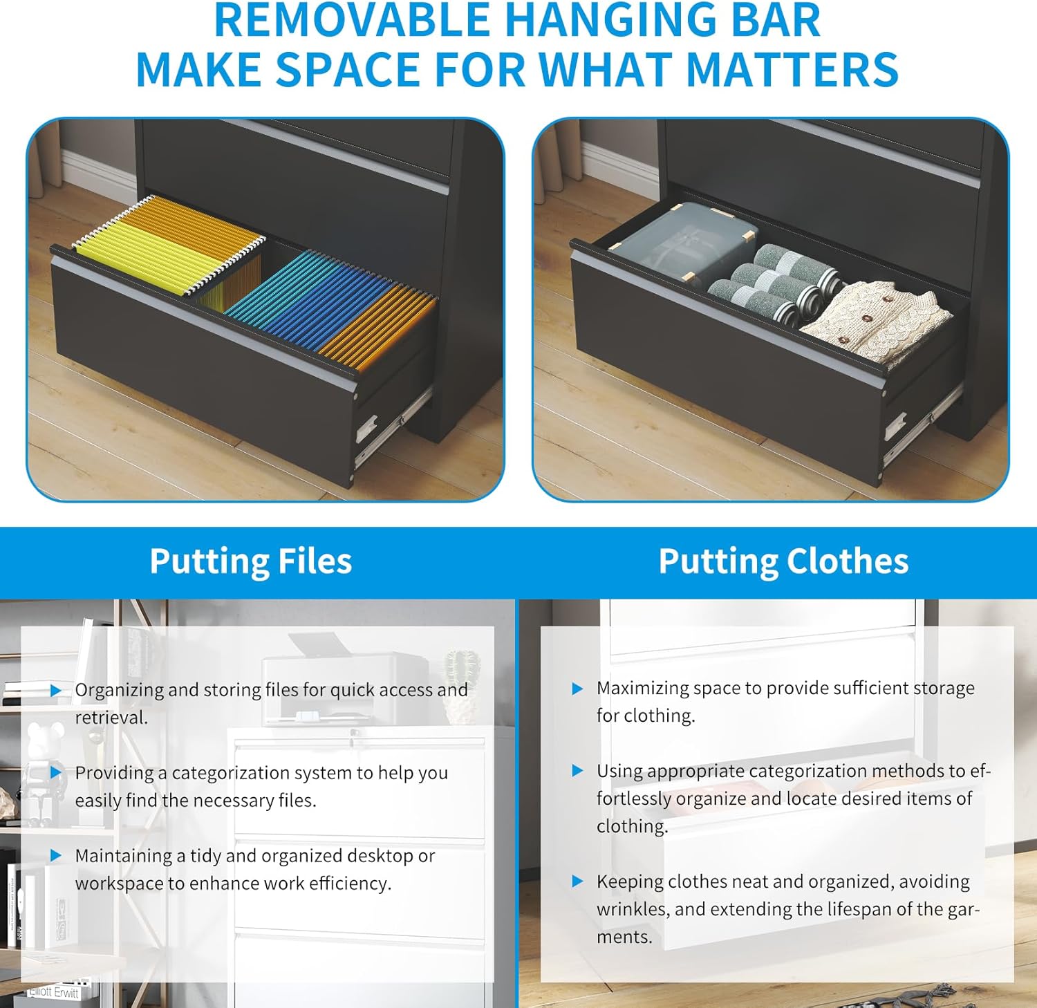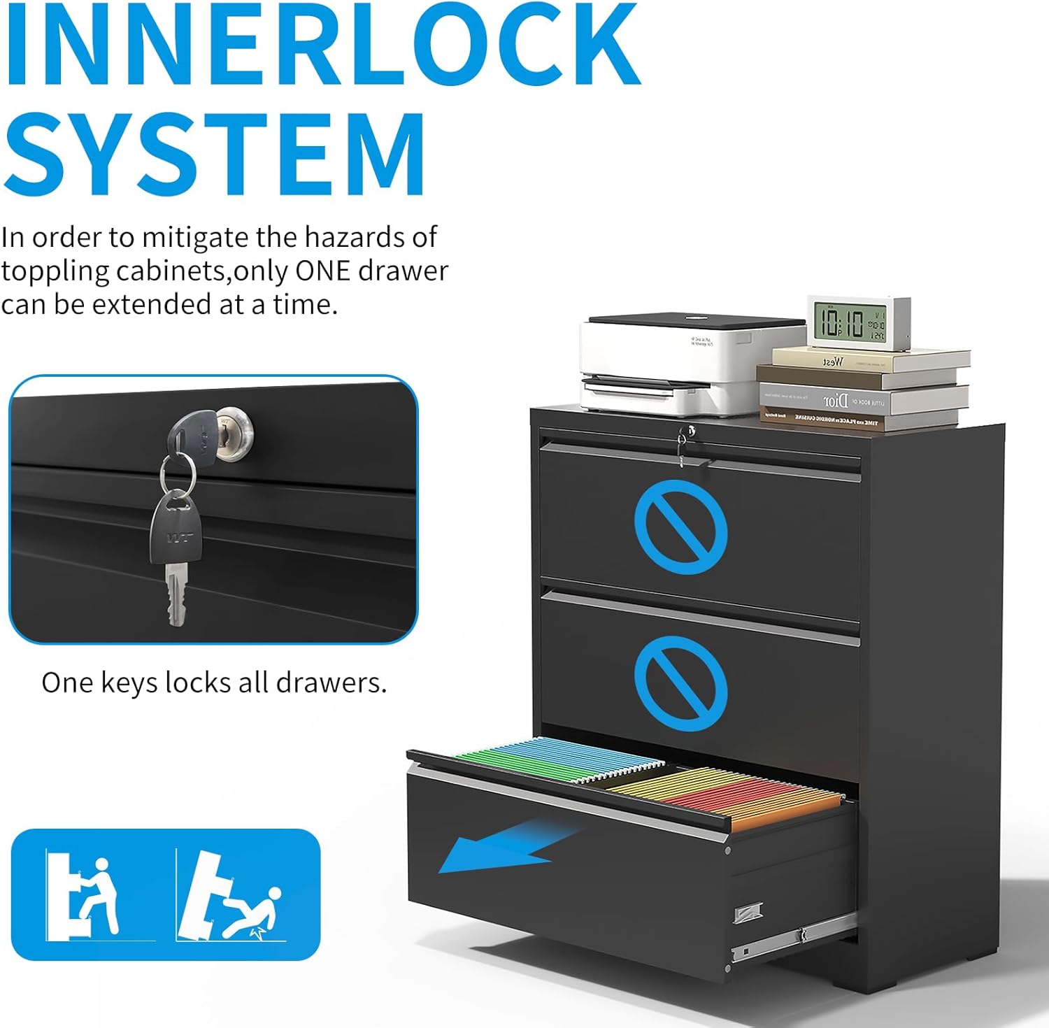 3 Drawer Lateral File Cabinet with Lock, Metal Lateral Filing Cabinet for Home Office, Steel Wide Horizontal Filing Cabinets for Letter/Legal/A4/F4 Hanging Files (Black)