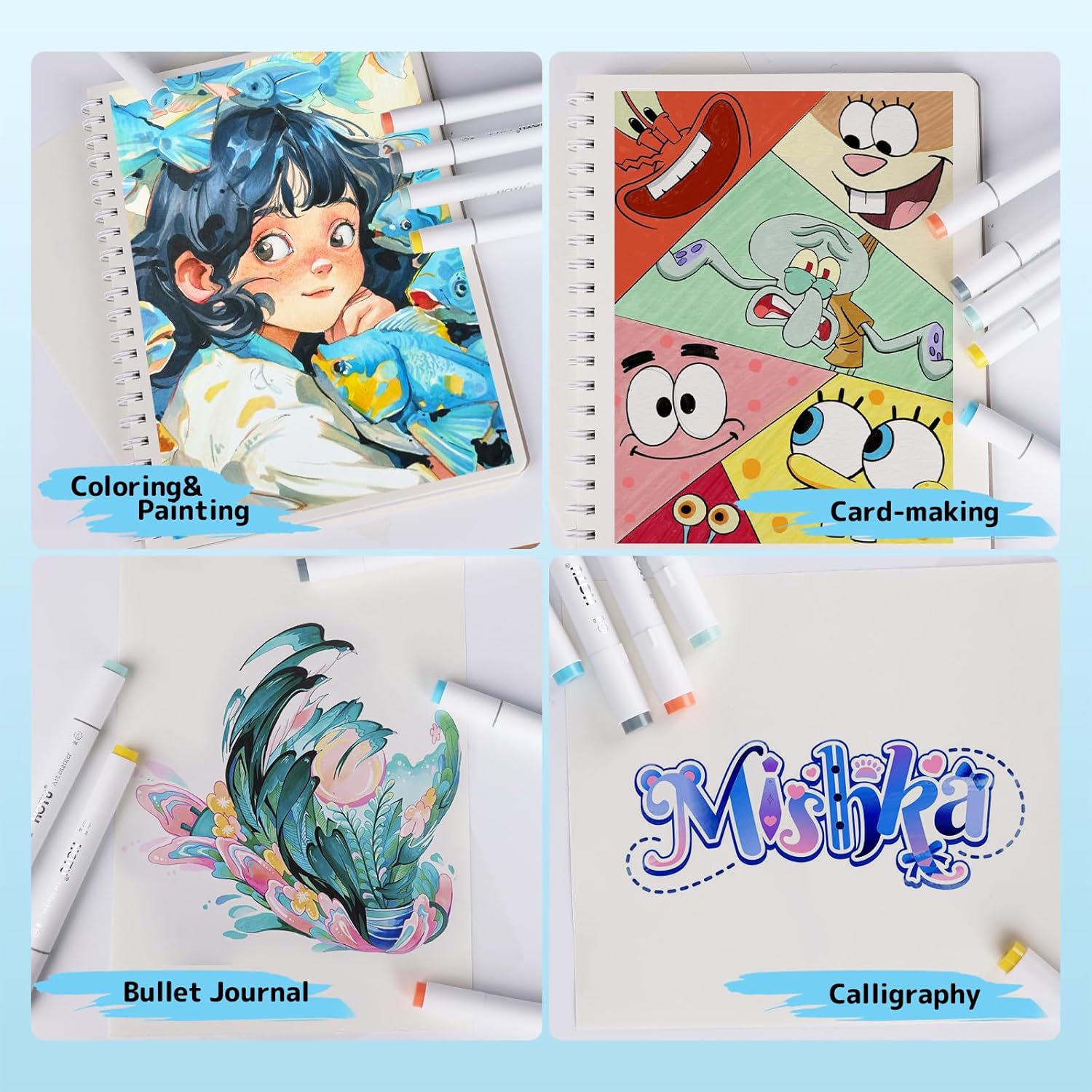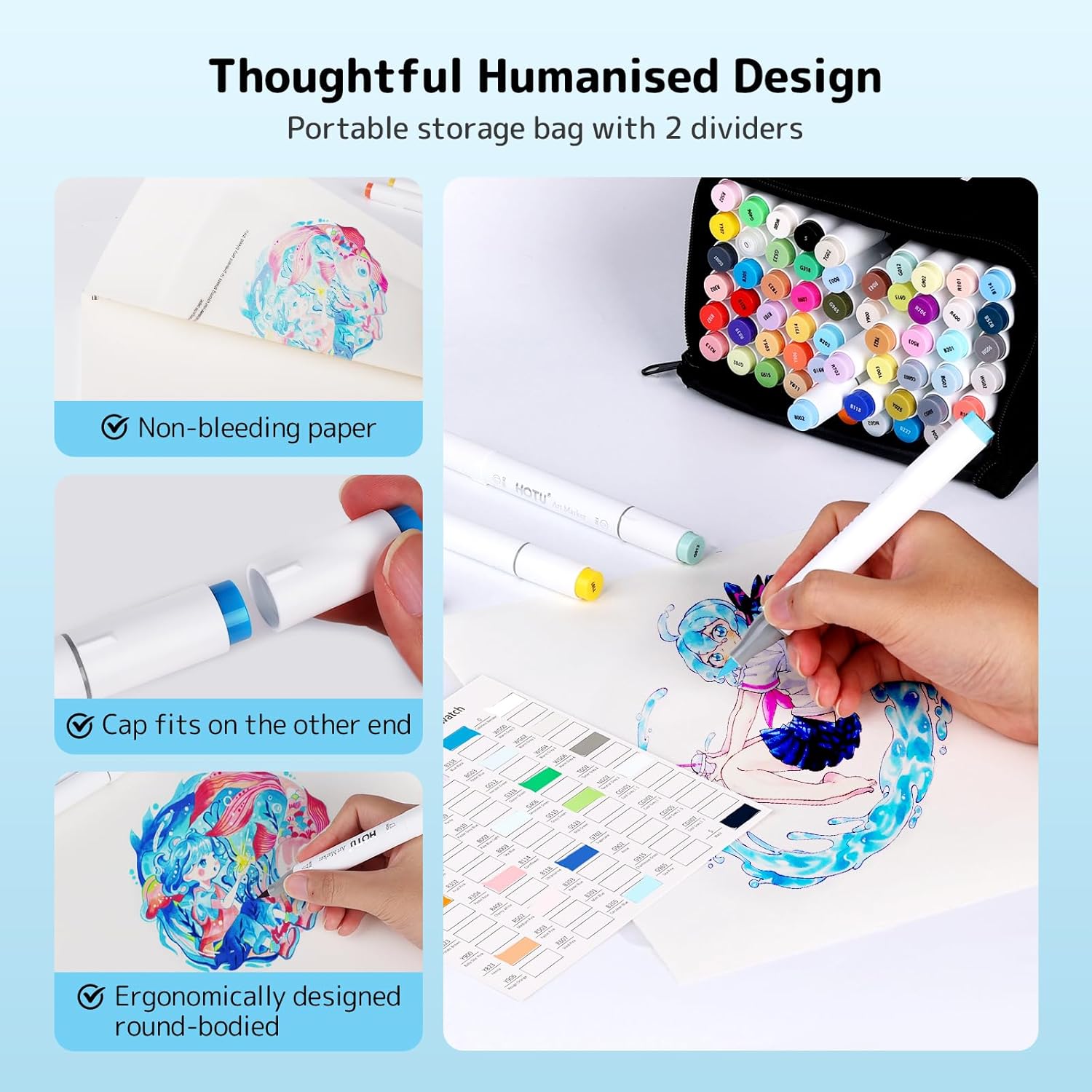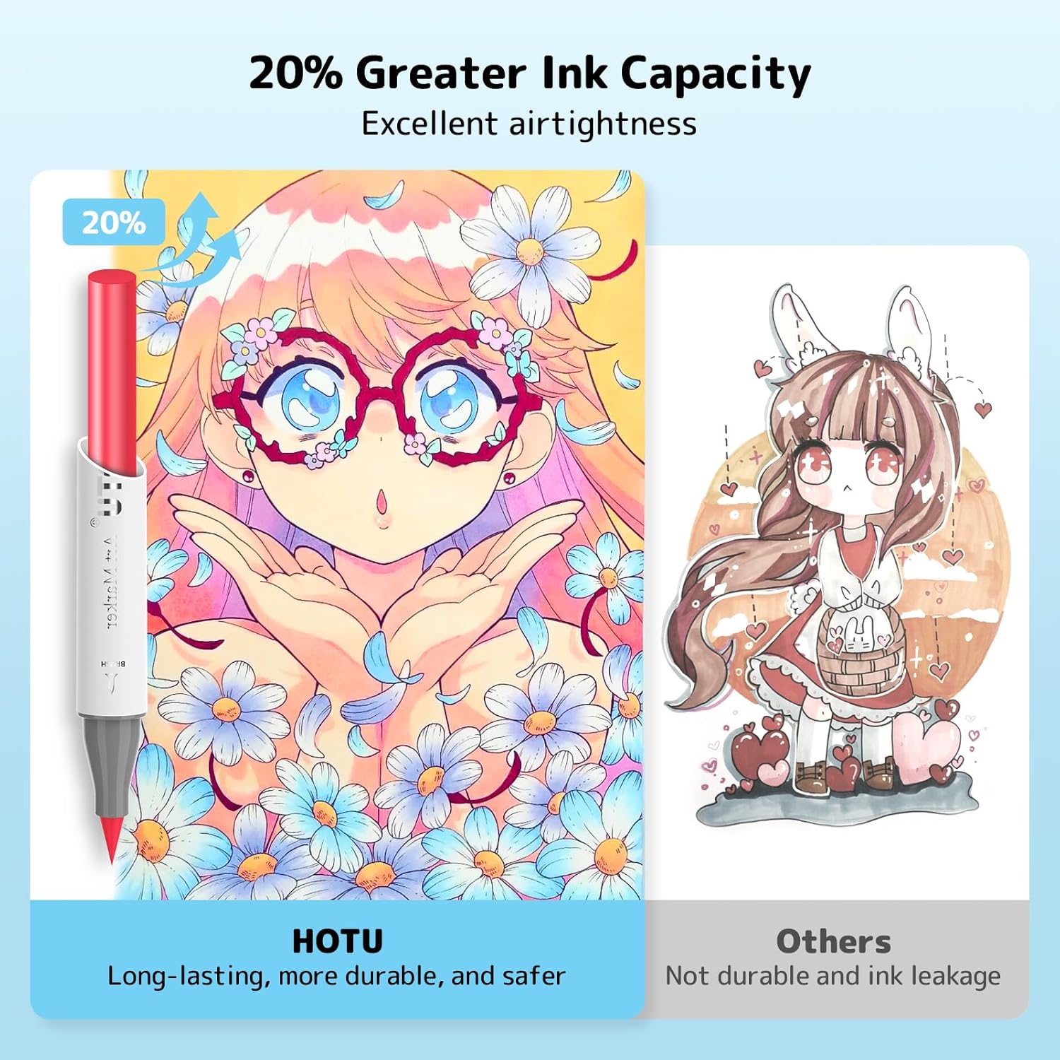 - 🎨SEAMLESS COLOR BLENDING - Alcohol markers with HOTU's high-quality ink, uniform ink flow ensures seamless color blending, eliminating grains and stripes. Markers boasting a massive 3.8G ink capacity for extended use, the alcohol-based ink dries quickly, paired with an anti-bleeding pad to ensure a clean and perfect finish.