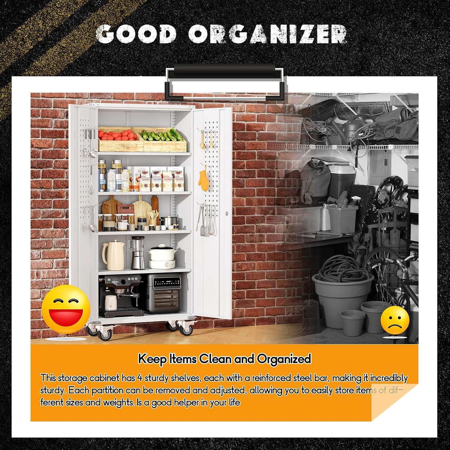 Greenvelly 72" Metal Storage Cabinet with Wheel and Pegboard, Lockable White Metal Garage Cabinets with 2 Doors and 4 Adjustable Shelves, Rolling Steel Tool Cabinet for Garage, Home Office, School
