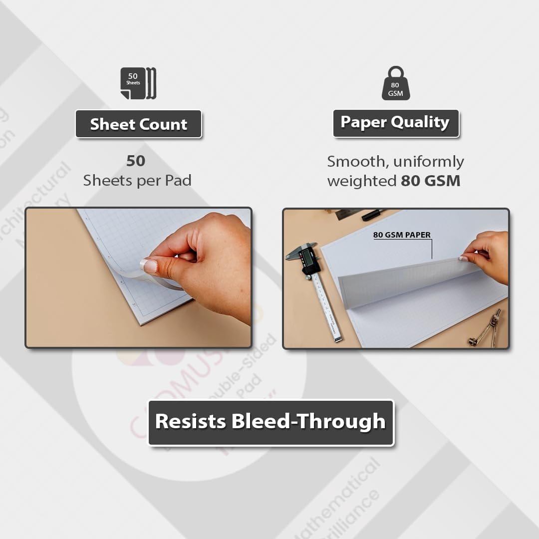 - Ample Sheets & Durable Construction: Each large graph paper pad includes 50 graph sheets, providing extensive space for your detailed work. Top glue binding ensures you can fully utilize the page. Designed for durability, the pad features a robust 1200 GSM, 2mm thick cardboard backer that offers max. protection, preventing bending & damage. High-quality construction ensures that graph paper pad remains reliable & sturdy, perfect for demanding professional use by engineers, architects & designers