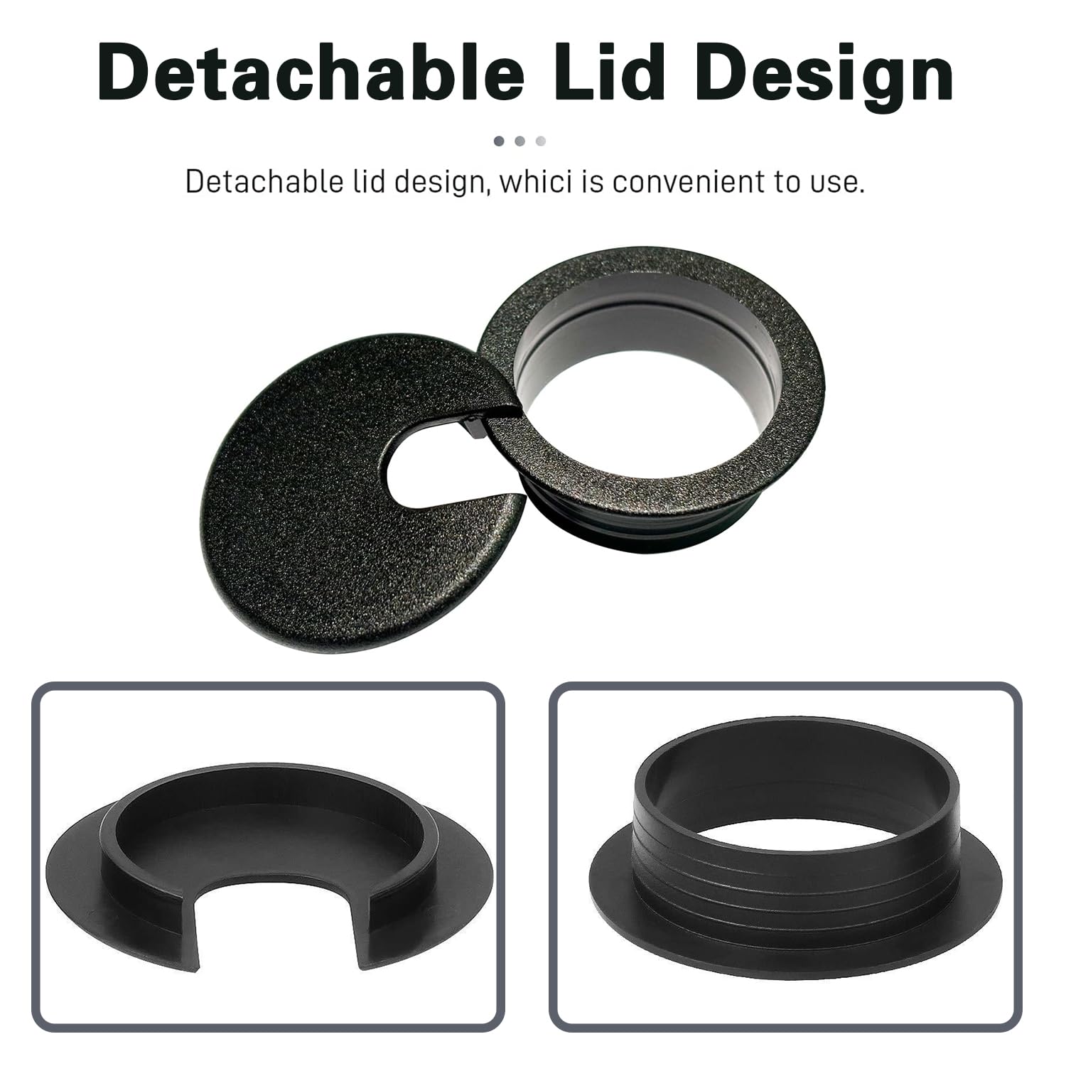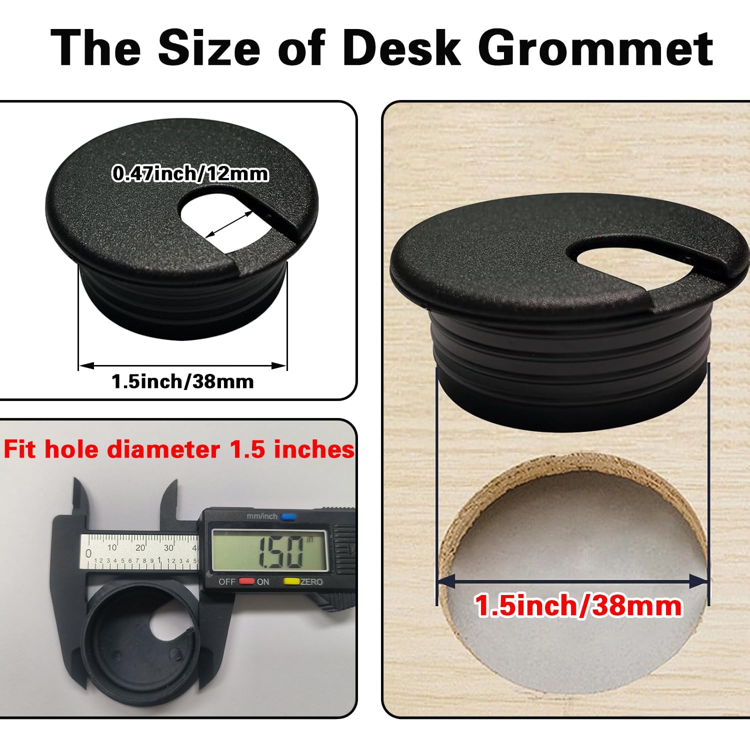 - Easy to Install and Use - Fits desk hole 1.5 inches(38mm). Remove the lid first, place the main part of the 1.5 inch grommet hole cover directly into the hole after drilling to add the wires and cables, and then close the lid.