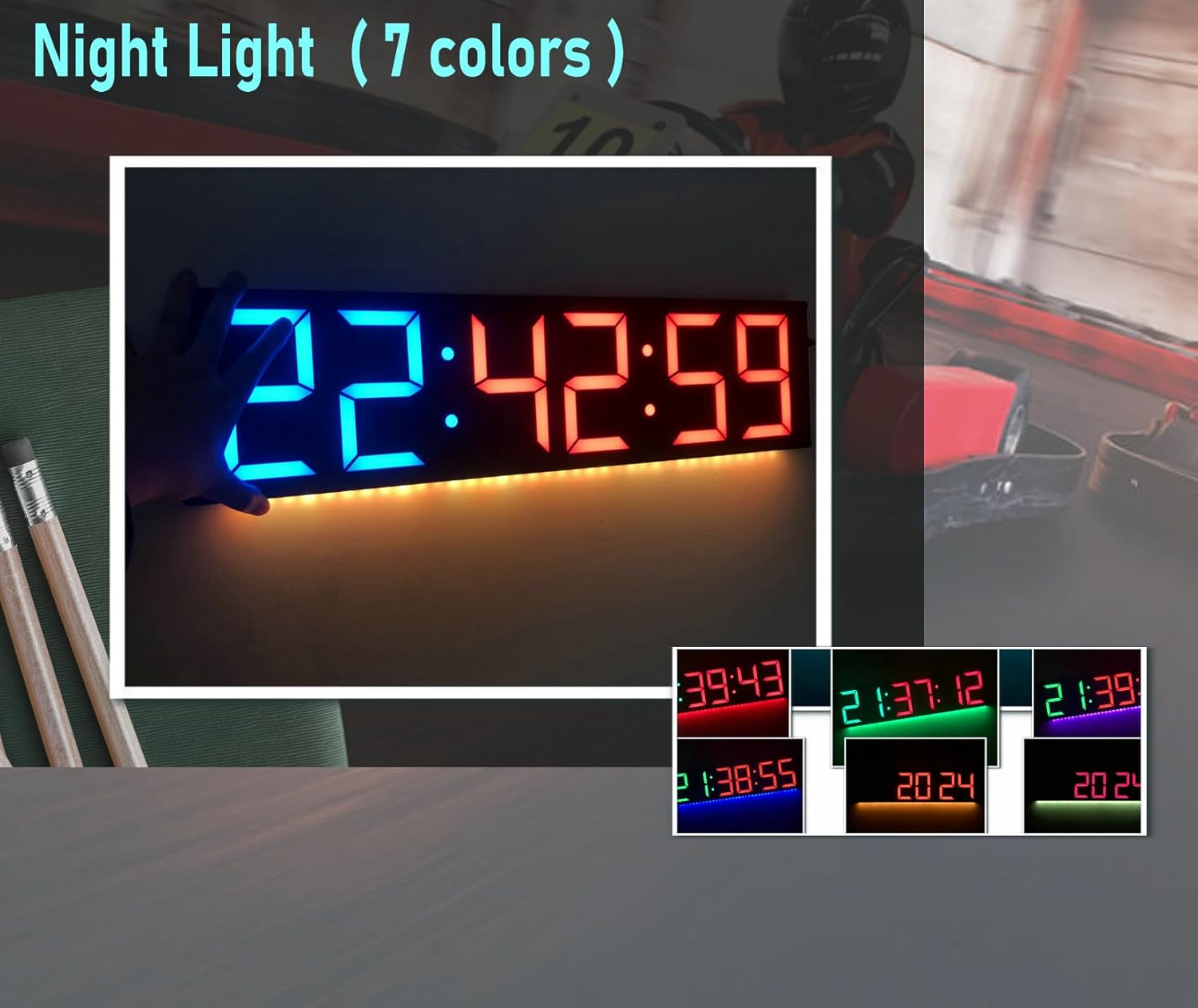 - 【7-Color Lights】-You can use this digital wall clock as night light, or atmosphere light. In sleep mode, light will be off by default, you can turn it on manually or choose your favorite light color by one-button easily. The brightness of light will keep changing together with brightness of the numbers.