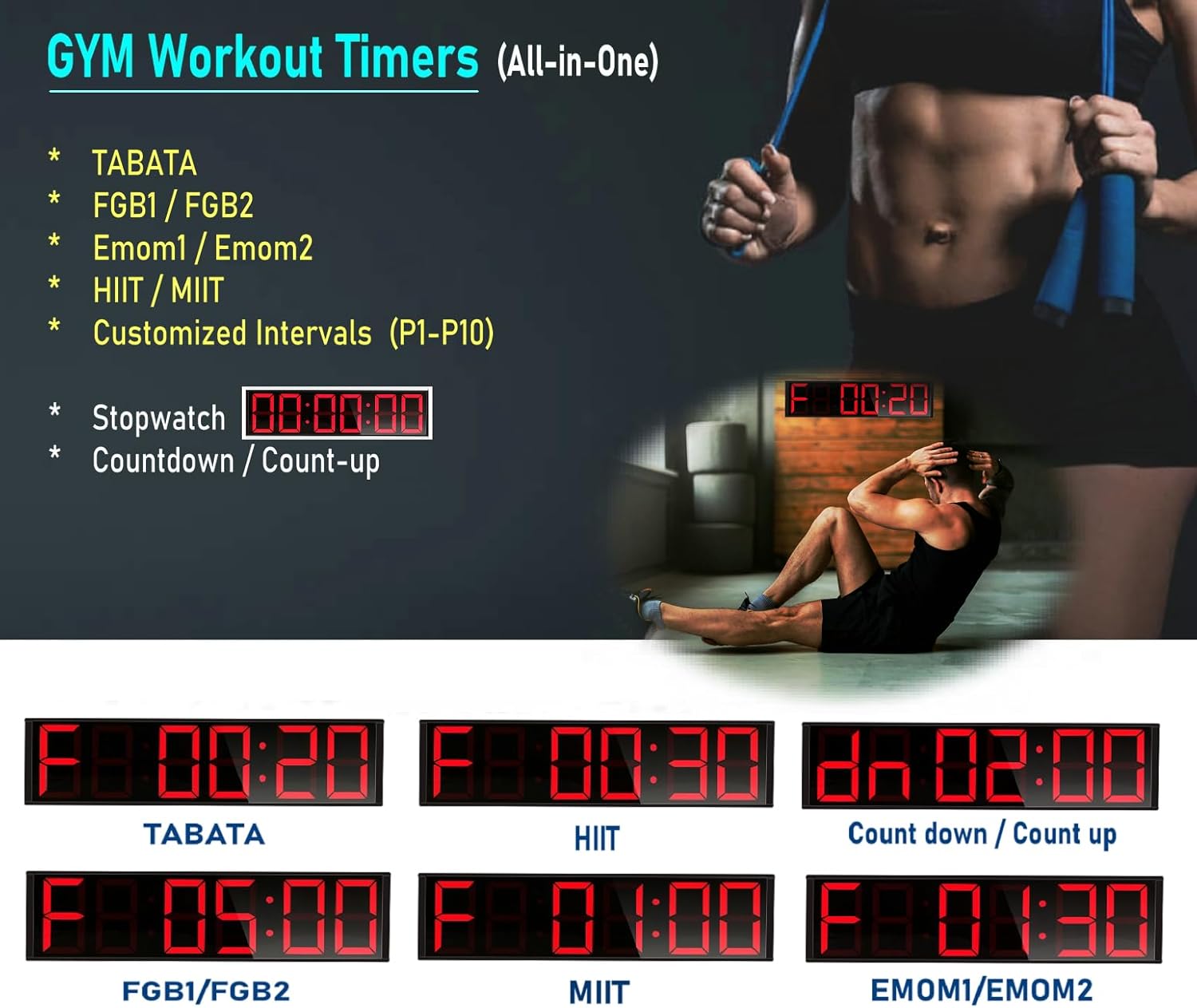 - 【Programmable GYM Workout Timers】-The GYM timers have been upgraded in 2024 according to users’ feedback, includes TABATA, EMOM, FGB, HIIT, MIIT, 10 CUSTOMIZED workouts, COUNTDOWN/UP, and STOPWATCH. You can easily do workouts with their default value by one-press, or make customized workouts by editing (Max: 99 cycles for all modes, except for stopwatch). It has 10-sec preparation time, and double-buzzers (up to 160 DB).