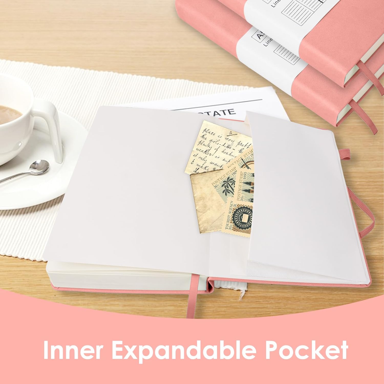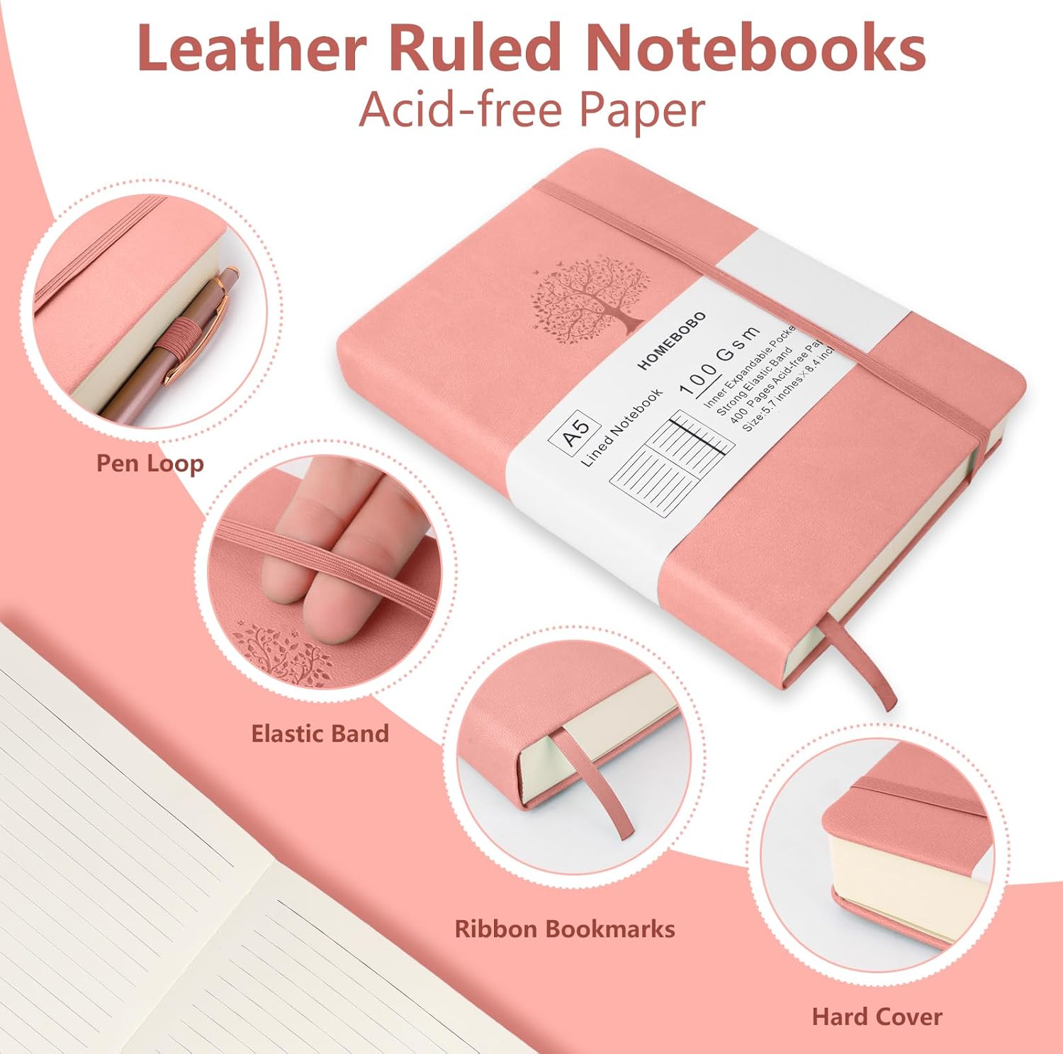 Journals for Writing, A5 Leather Ruled Notebook with 400 Pages, 100 Gms College Ruled Journal with Thick Paper, Hardcover with Inner Pocket & Pen Holder, Pink