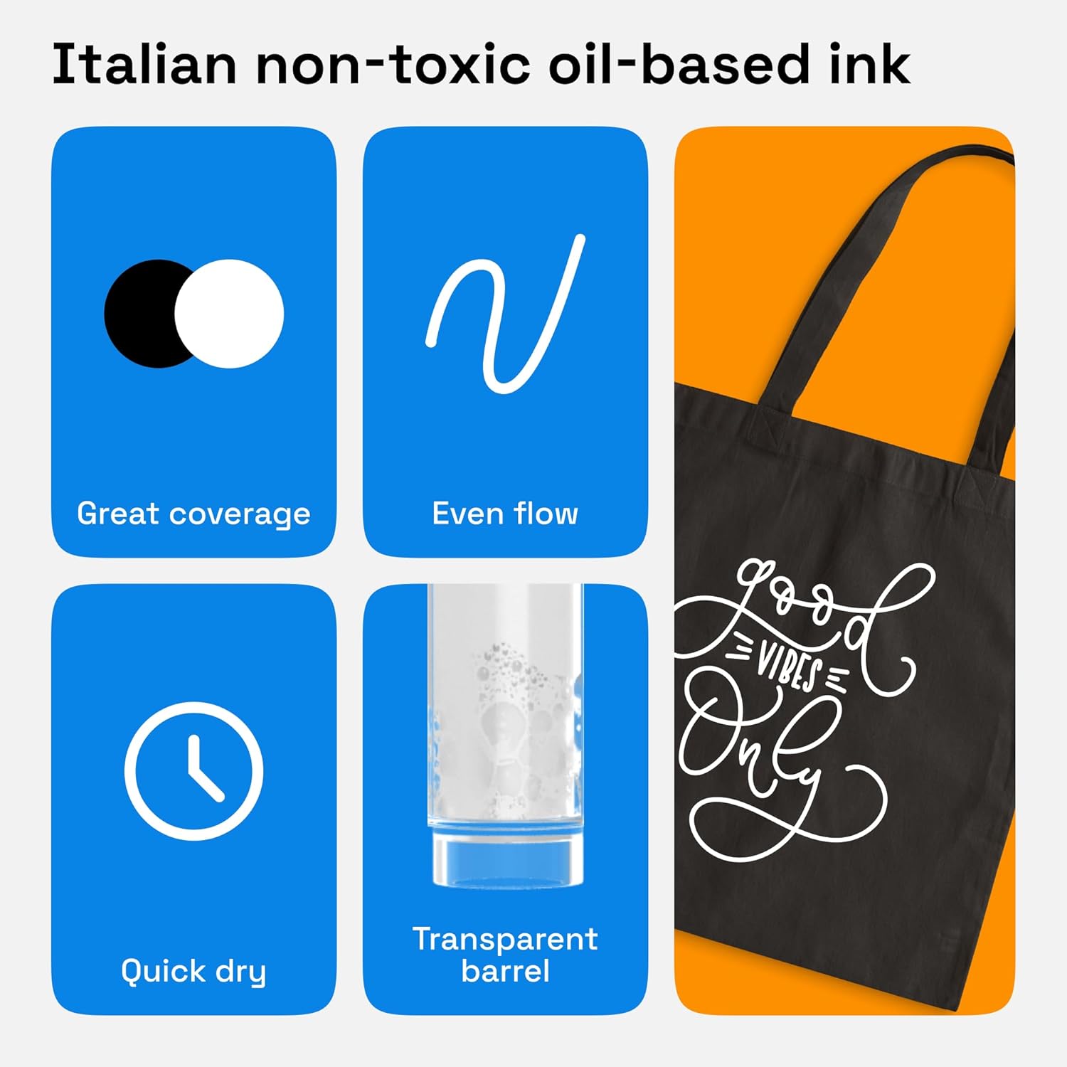 - Multiple Surfaces: Use these oil paint pens as oil markers for plastic and glass or as oil based fabric markers for clothes. Each white marker permanent is water-resistant. Theyโre also good for leather, vinyl, or epoxy resin. And the nibs are solid, even on rocks!