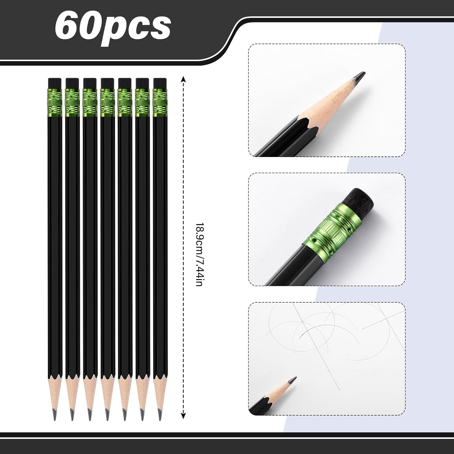 - Complete Your Writing Quest: dive into a writing journey with 60 pieces of quality wood cased pencils; Each plentifully packed kit comes with black barrel pencils capped with black erasers, wrapped in green metal, ensuring your daily study and drawing needs; It also serves as an ideal supply that you can delightfully share with classmates and friends