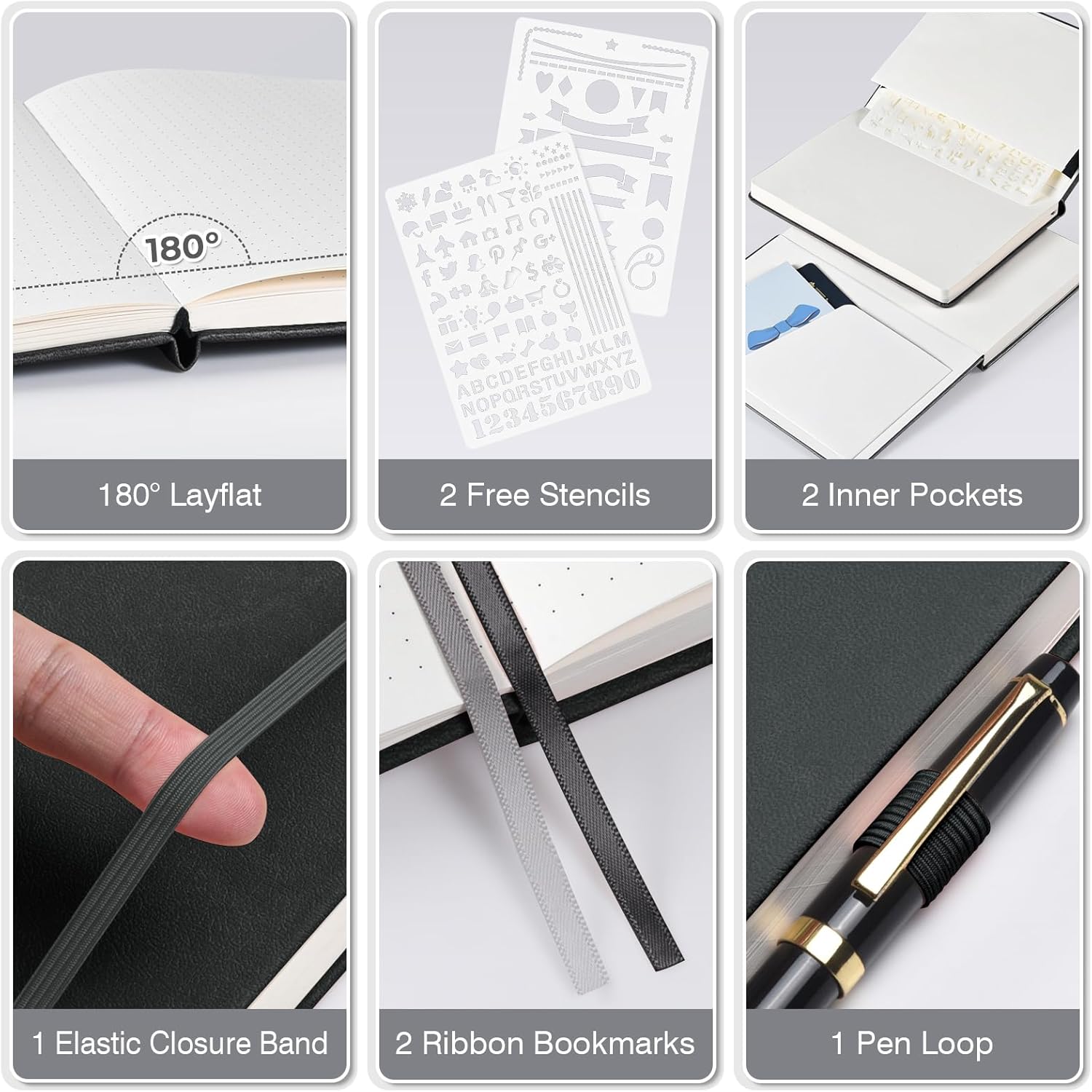 - 【Thoughtful Accessories】Complete with practical accessories, each bullet dotted journal book includes 2 pockets, 2 bookmark ribbons, 1 elastic band, and 1 pen loop. Additionally, each set comes with 2 free dot grid journal stencils featuring various graphics, letters, and numbers, enhancing creative possibilities for planning, documenting work, or artistic endeavors.