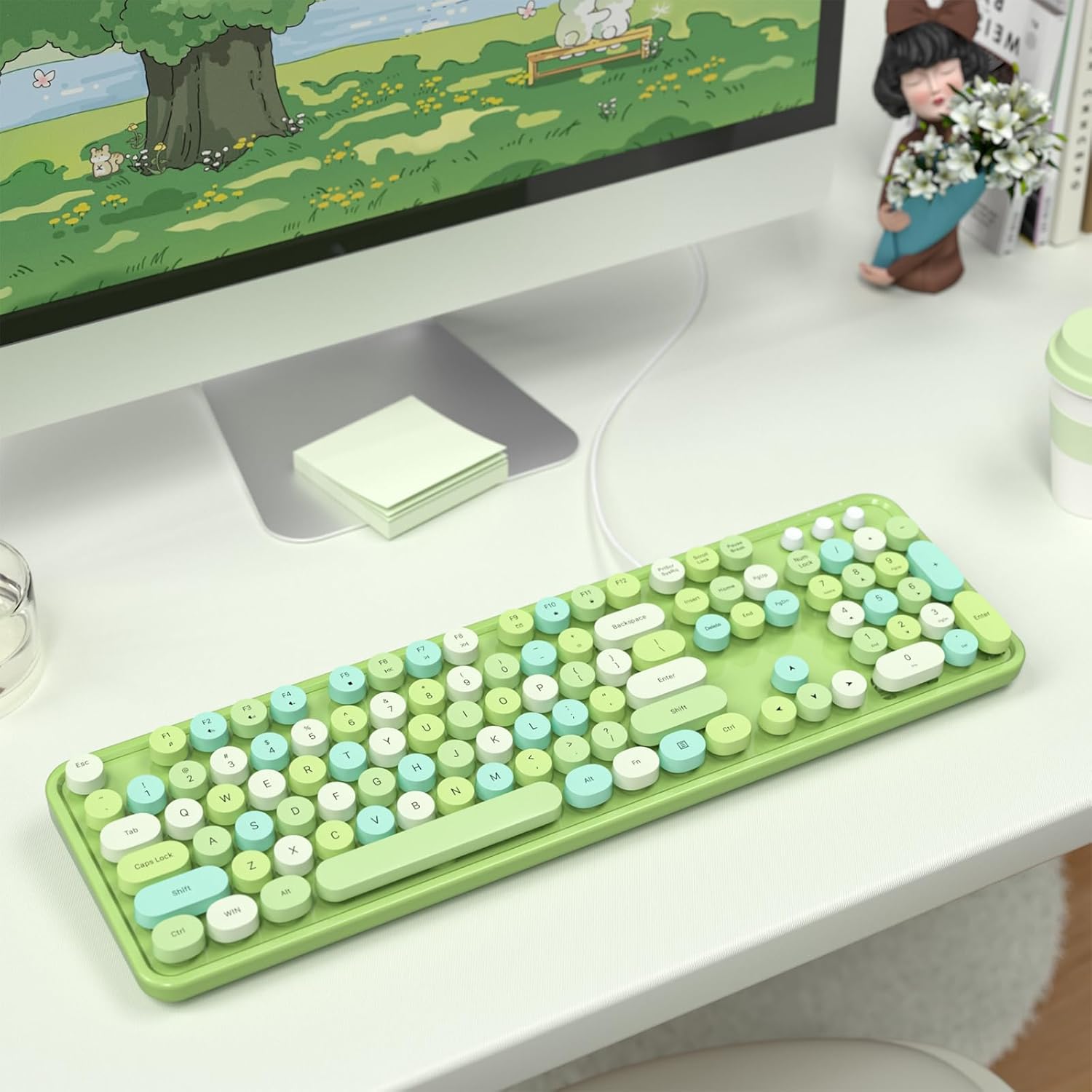 MOFII Wired Keyboard, Full Size USB Keyboard Plug Play, Colorful Retro Round Typewriter Keyboard with Foldable Stands for Windows PC Laptop (Green Colorful)