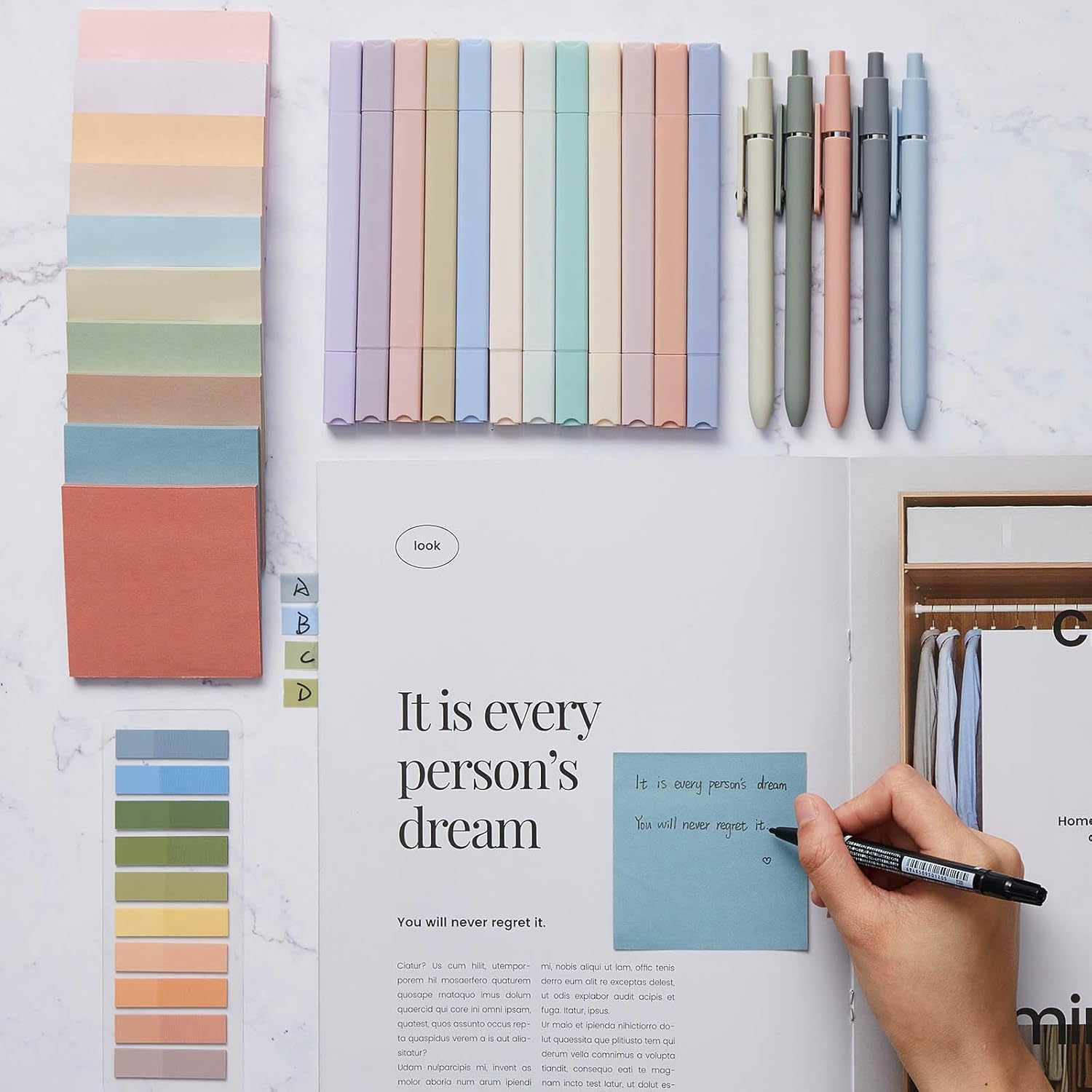 Jutom 38 Pcs Book Annotation Kit Aesthetic Highlighters Gel Pens Set Sticky Notes Tabs Markers Dual Ended Highlighter Quick Dry Ink Pens for Office Annotating Books(Retro Color,Square)