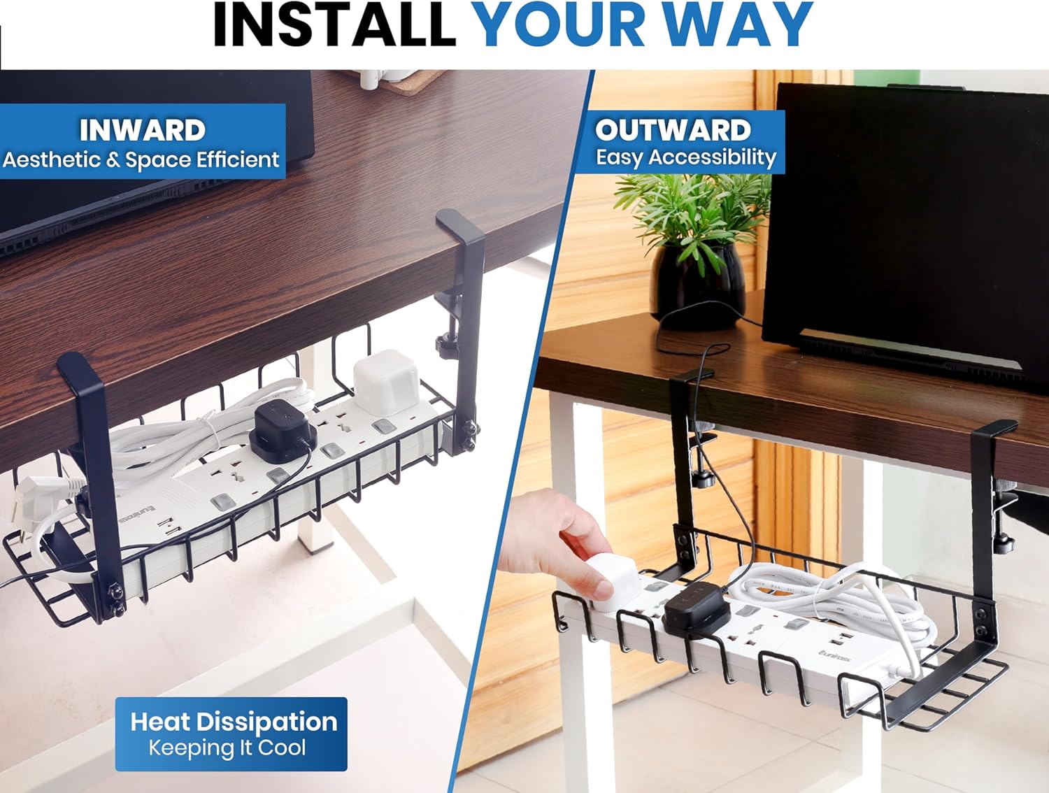 - 【Install Your way: Inward or outward】- The cord organizer for desk offers flexible installation-Inward for cable concealment or Outward for easy access. Computer cable management mesh design prevents dust accumulation, enhances heat dissipation making under desk cable organizer an optimal solution for standing desk cable management.