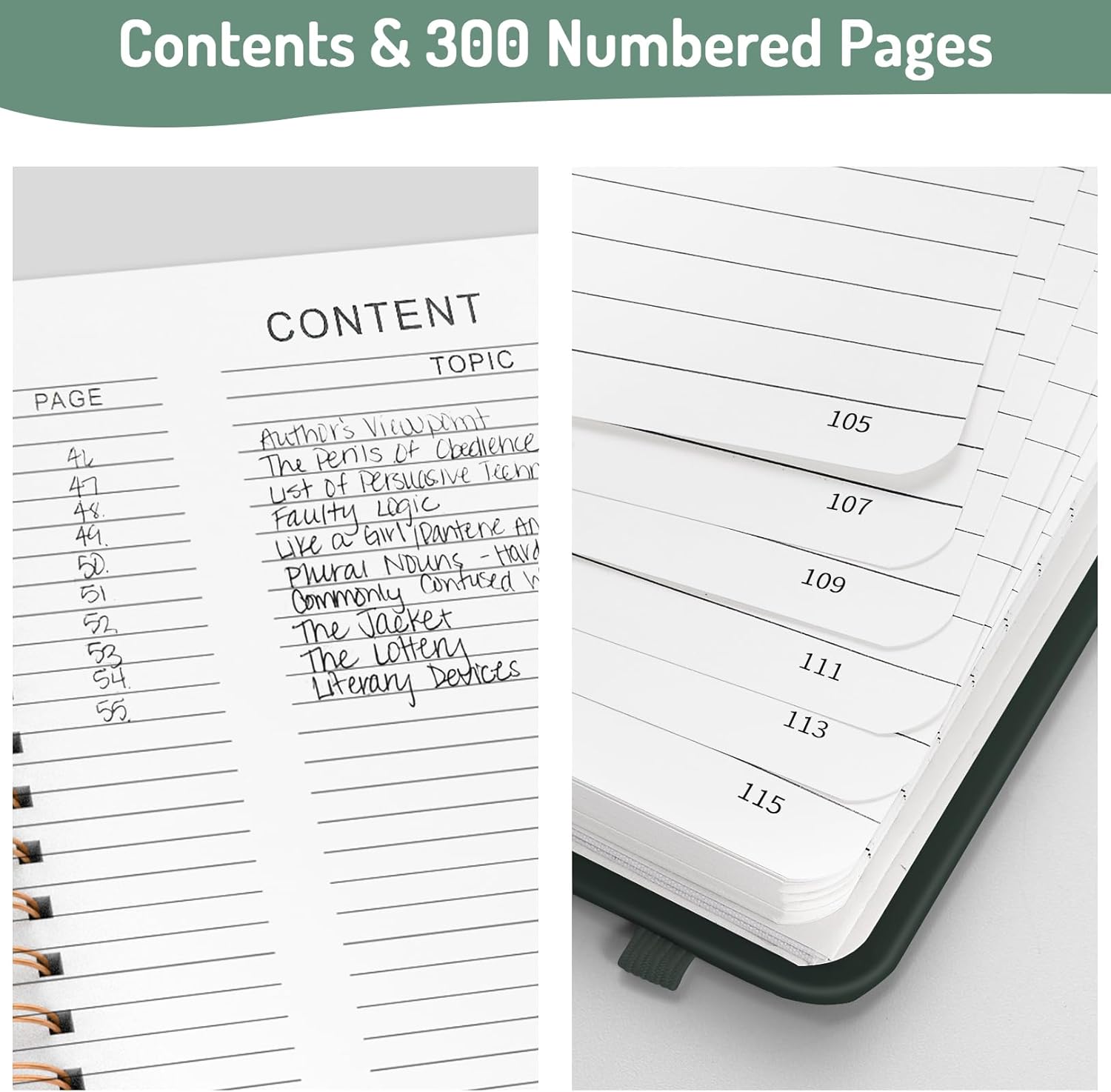 Forvencer A4 Lined Spiral Journal Notebook with 300 Numbered Pages, 11" X 8.5" Thick Journals for Writing with 100GSM Paper, Hardcover Notebooks with Contents for Work, School, Dark Green