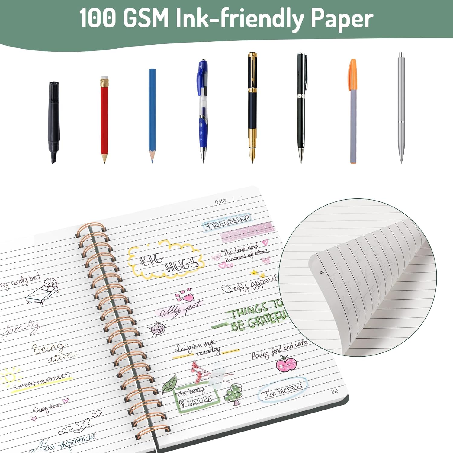 - 100 GSM Ink-friendly Paper: the pages are very thick which avoid ink bleeding through, ghosting. Suitable for most pen types, such as ballpoint pens, fountain pens, gel pens and so on. Allowing you to write on both sides of every page to maximize your usable space.