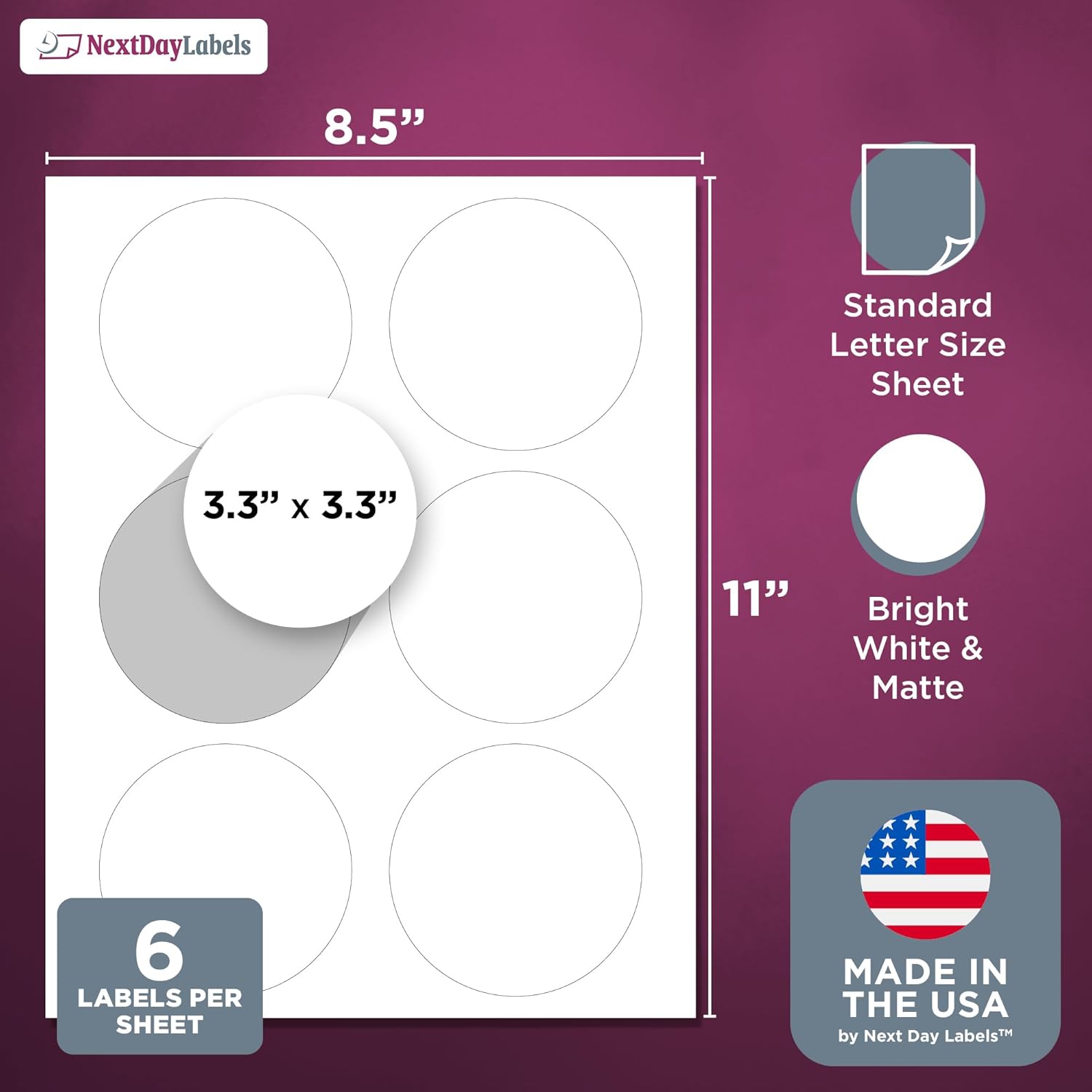 NextDayLabels 3.33 Inch Round Stickers for Printer - Matte White Blank Laser/Inkjet Printable Circles (50 Sheets, 6 Per Sheet, 300 Labels)