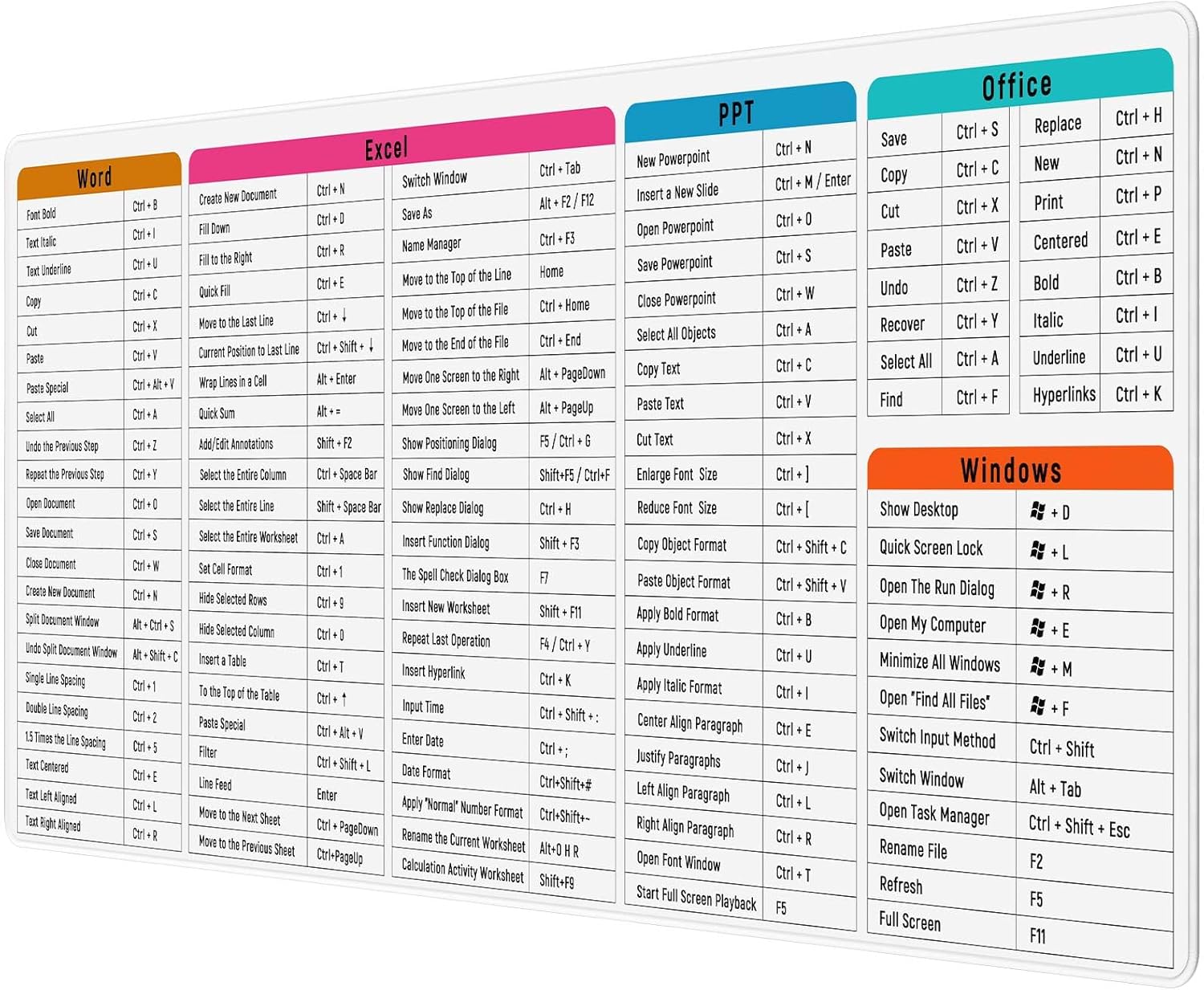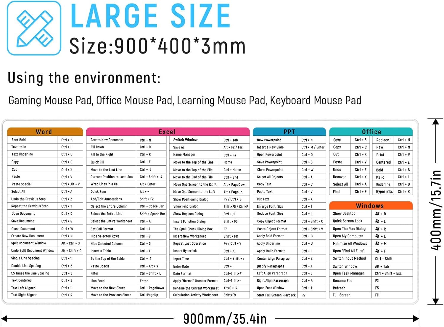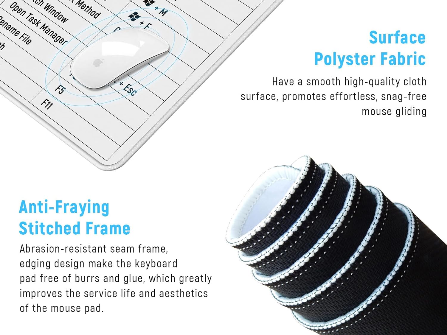 JIALONG Large Gaming Mouse Pad Extra XXL 35.4x15.75 inches Thick Extended Desk Pad Ergonomic Computer Keyboard Pad Mat for MacBook, PC, Laptop, Office Home White Excel Shortcuts