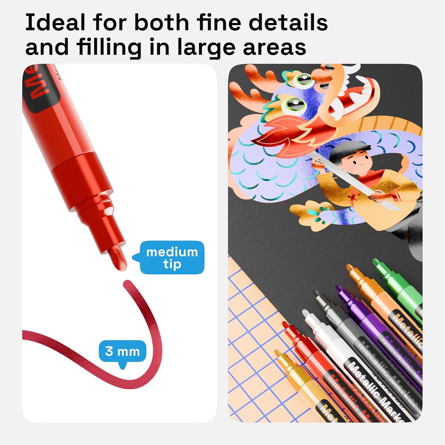 - 3mm Tip for Coloring: Make details with metallic marker pens fine point. Use the black paint pen or color metallic paint pens fine for outlines, lettering, and adding labels. Fine metalic markers are easy to activate.