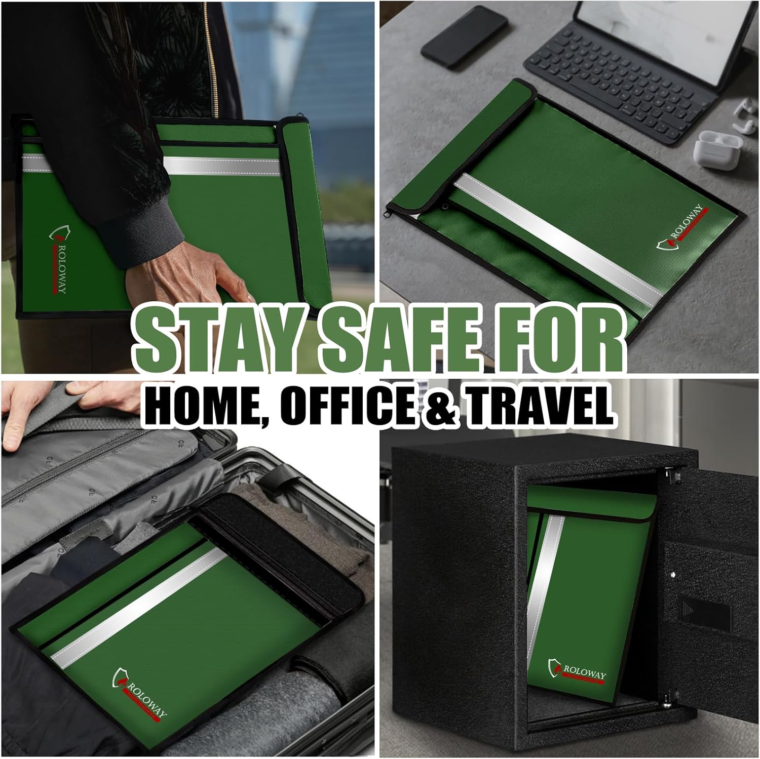 ROLOWAY Fireproof Document Bag (15.5 x 11.5 inch) with 2 Pockets and 5200℉ Aluminum Foil Layer, Fireproof Bag for Document Safe (Green)
